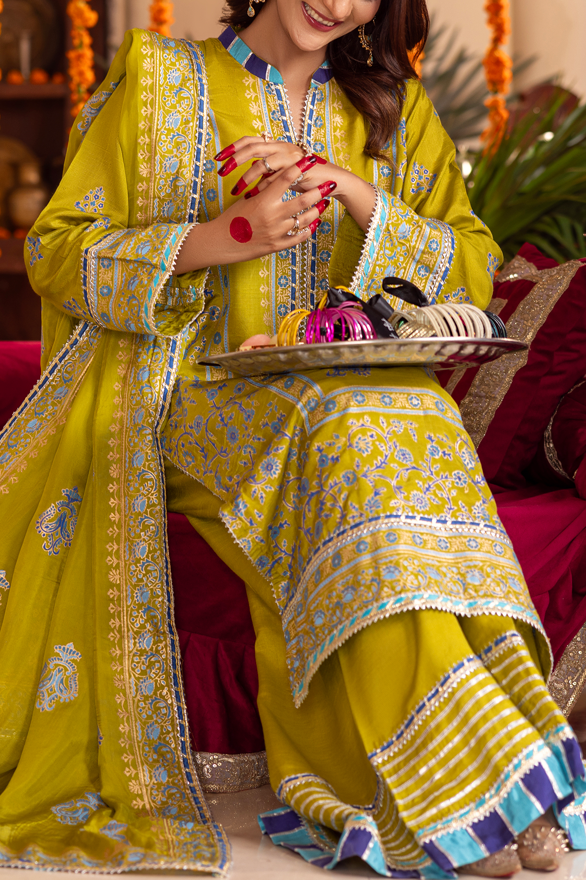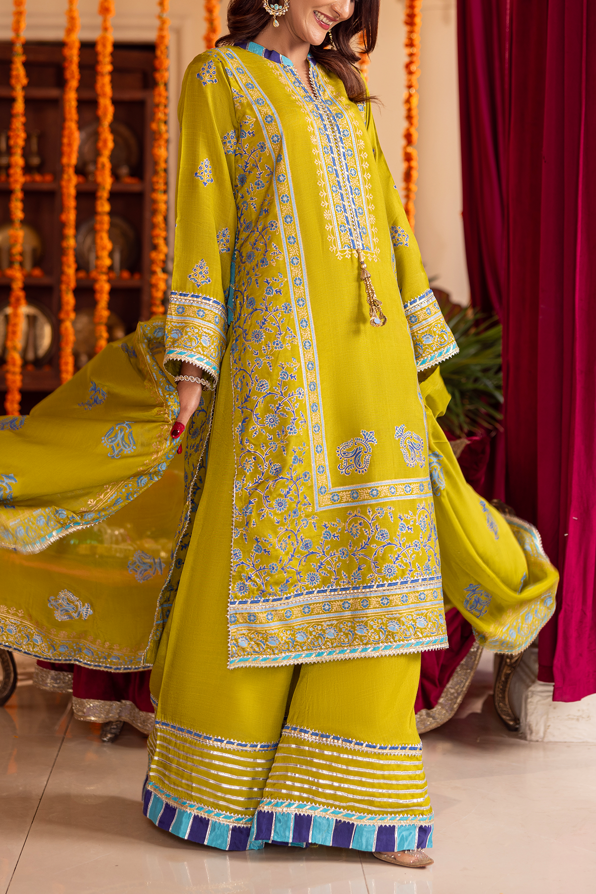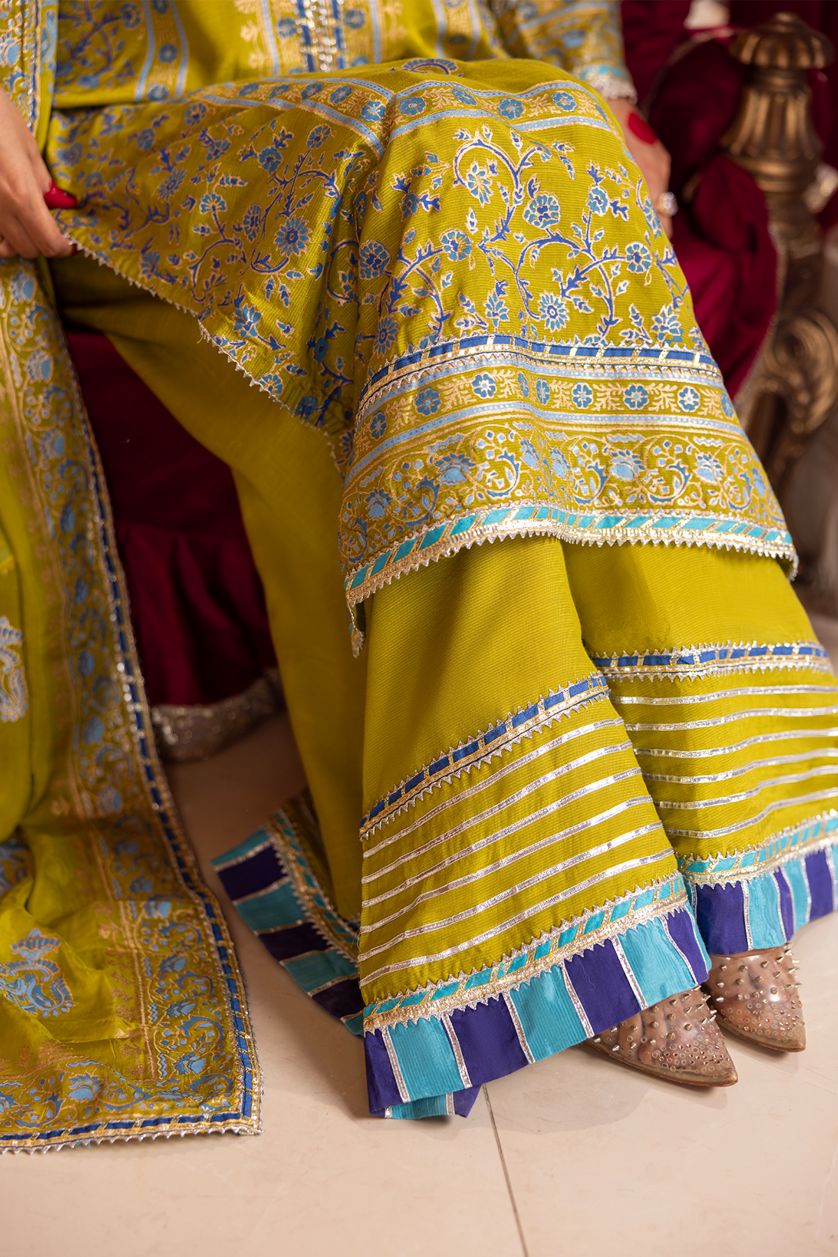 This bright lime ensemble features intricate blue floral block print and tassel detailing on the neckline. Paired with wide-leg trousers and a flowing silk dupatta, it creates the perfect festive look.