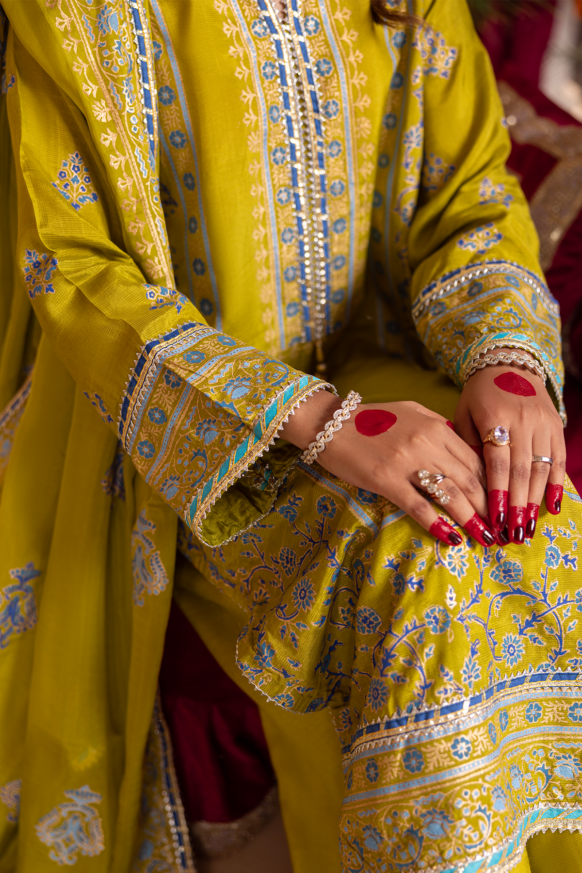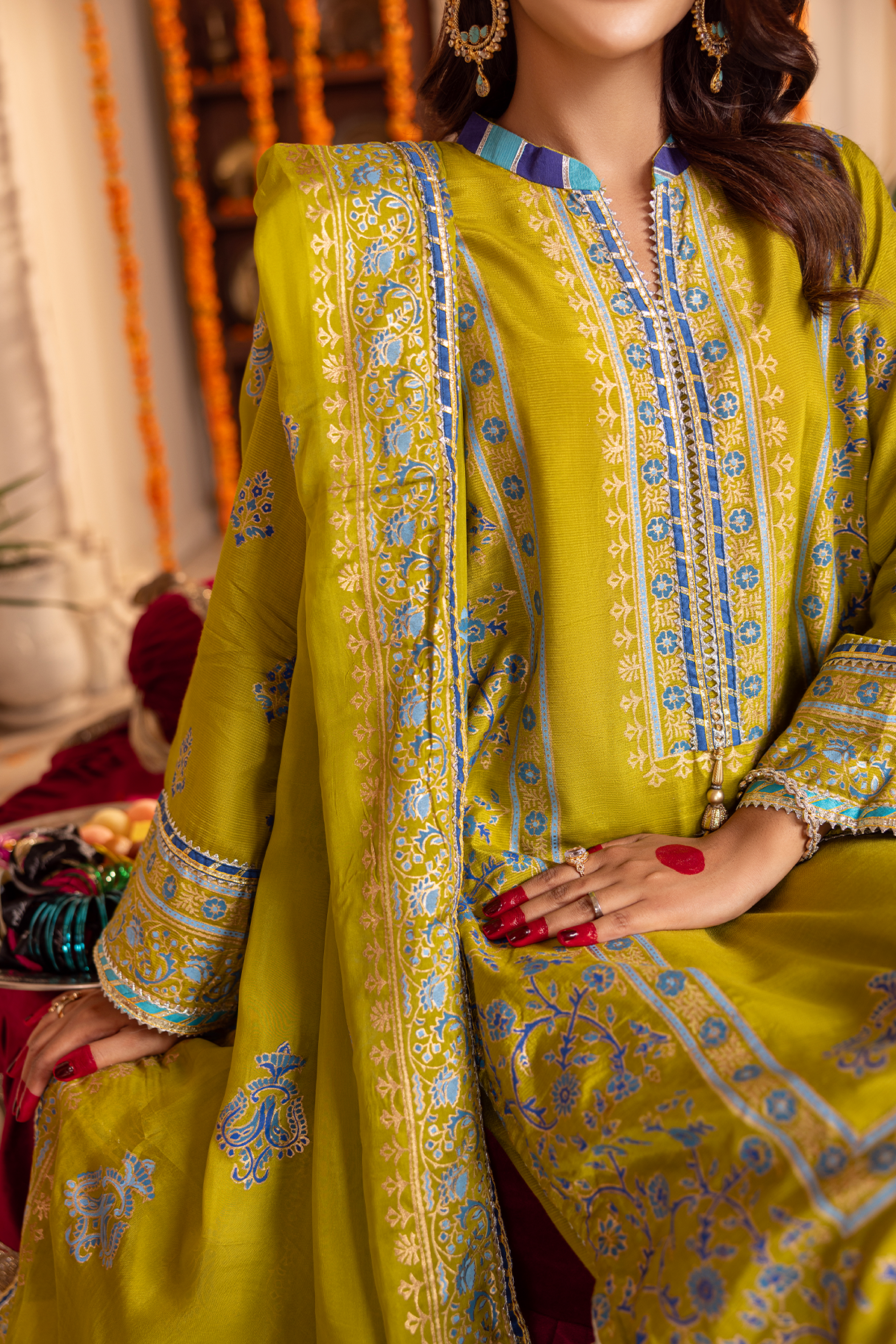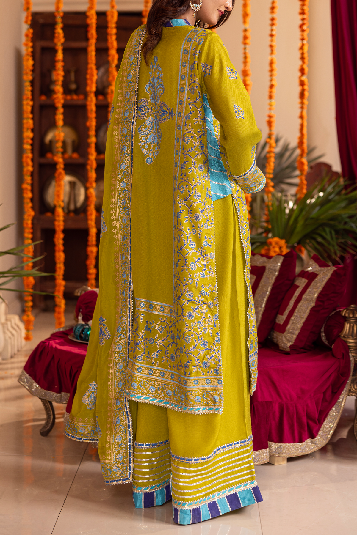 This bright lime ensemble features intricate blue floral block print and tassel detailing on the neckline. Paired with wide-leg trousers and a flowing silk dupatta, it creates the perfect festive look.