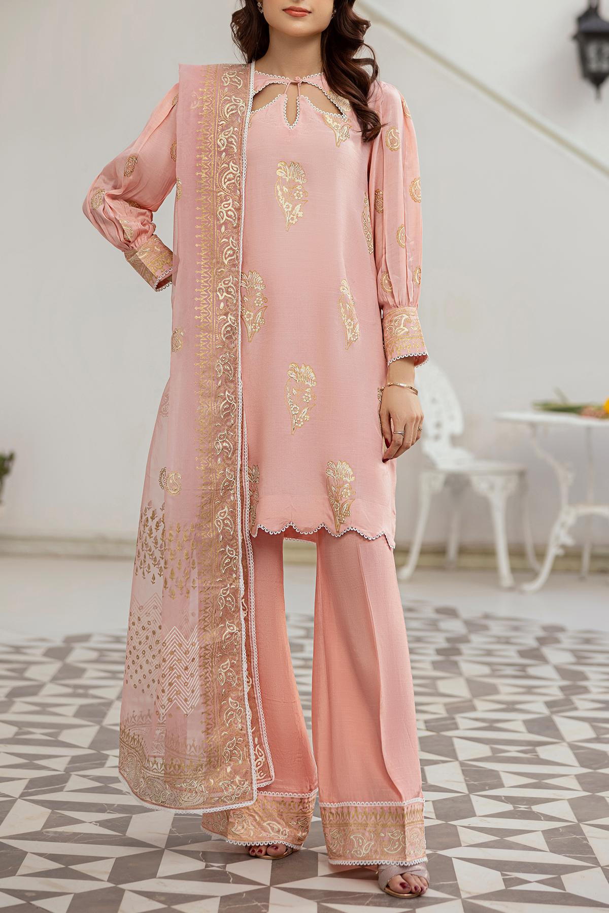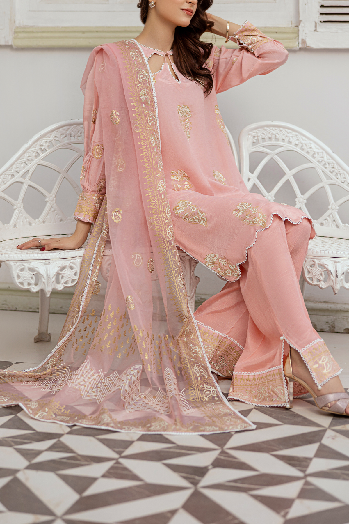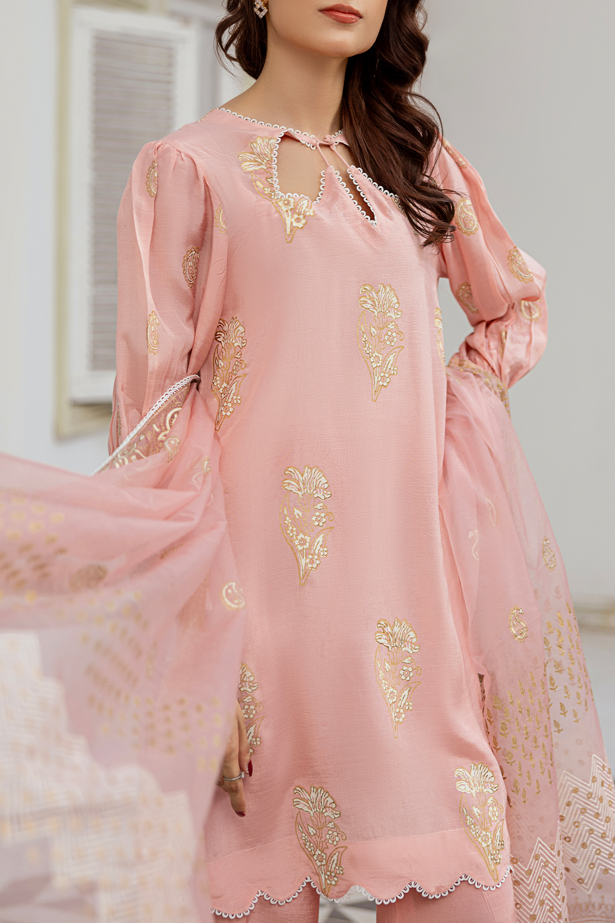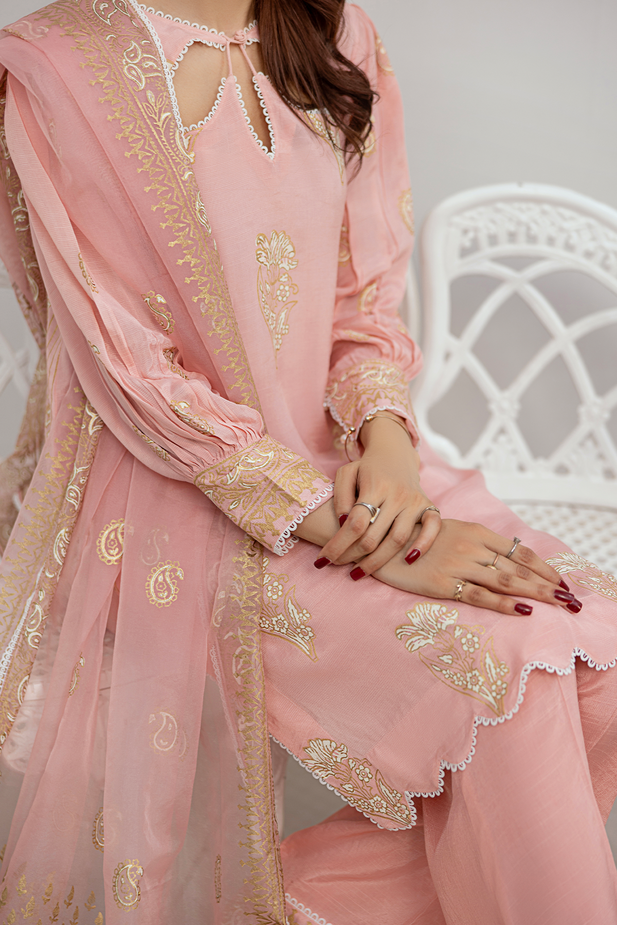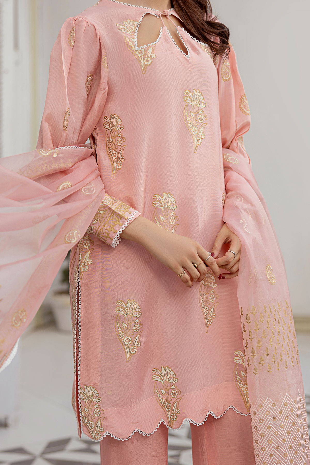 A soft pink ensemble with delicate block print, paired with wide-legged pants and a matching organza dupatta. This 3-piece unstitched outfit features ivory and golden block printing for charm and allure, allowing for customization and personalization. Ideal for those who value detailed craftsmanship and unique design.