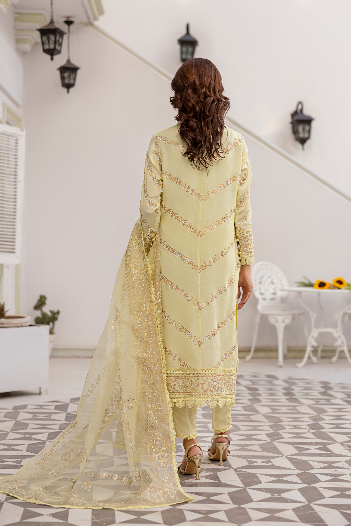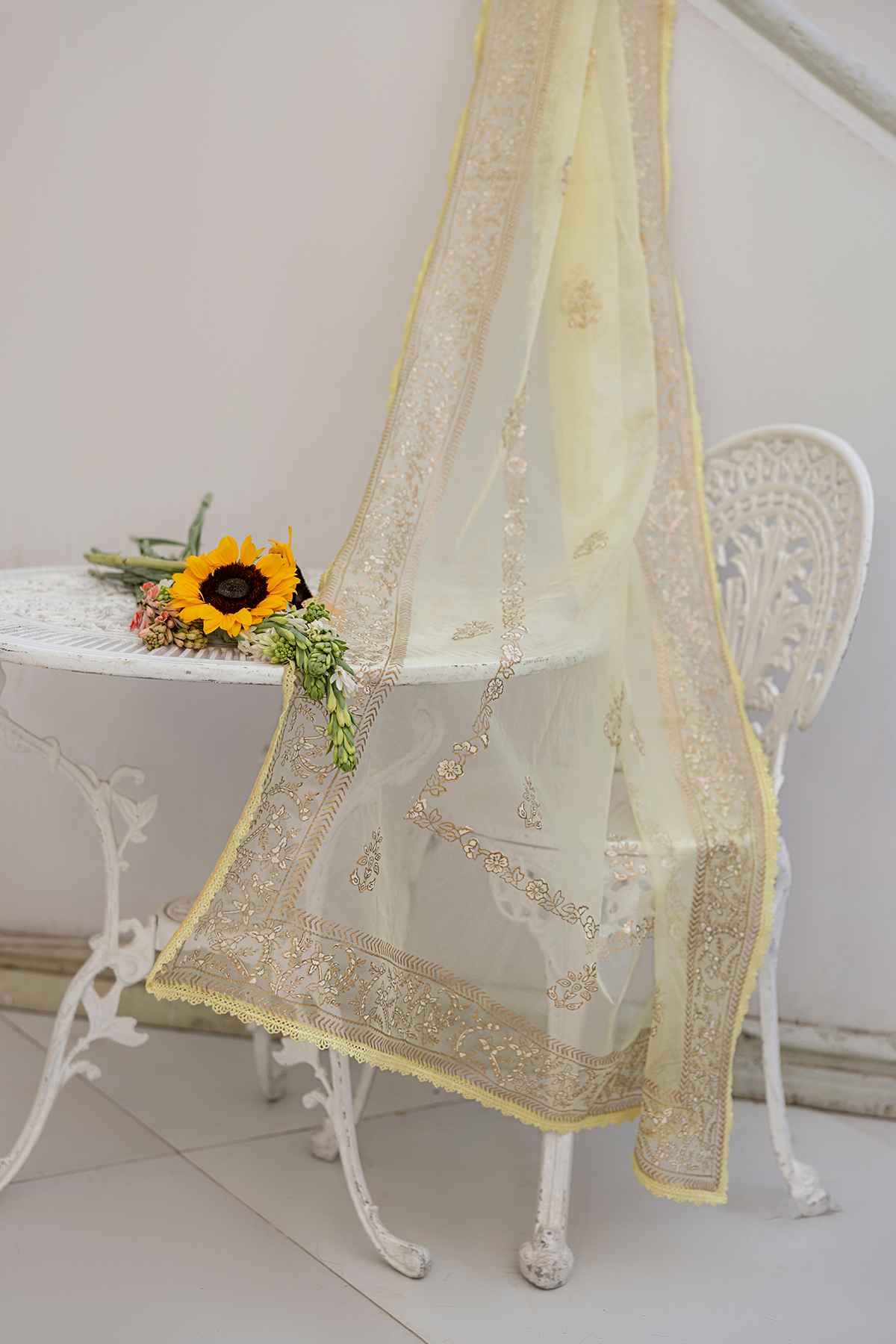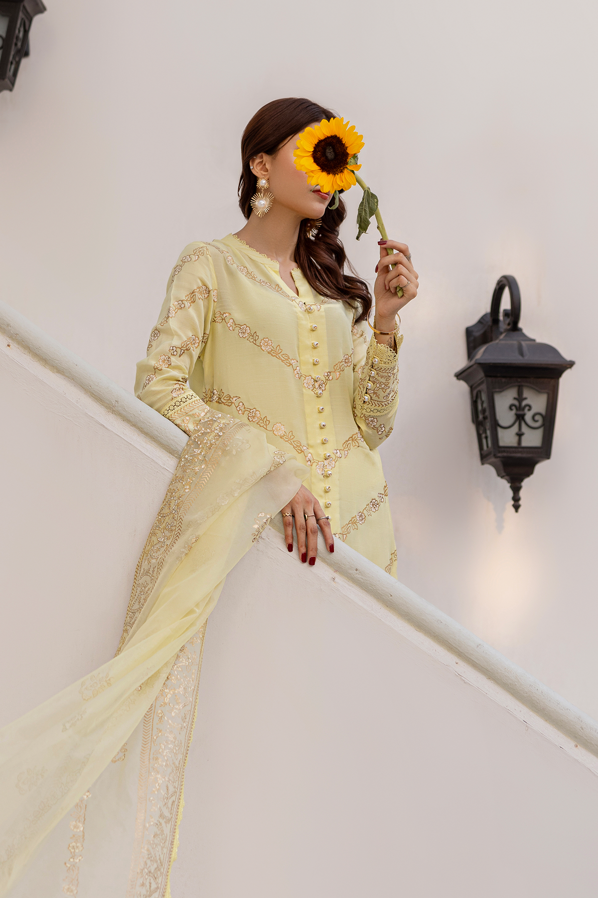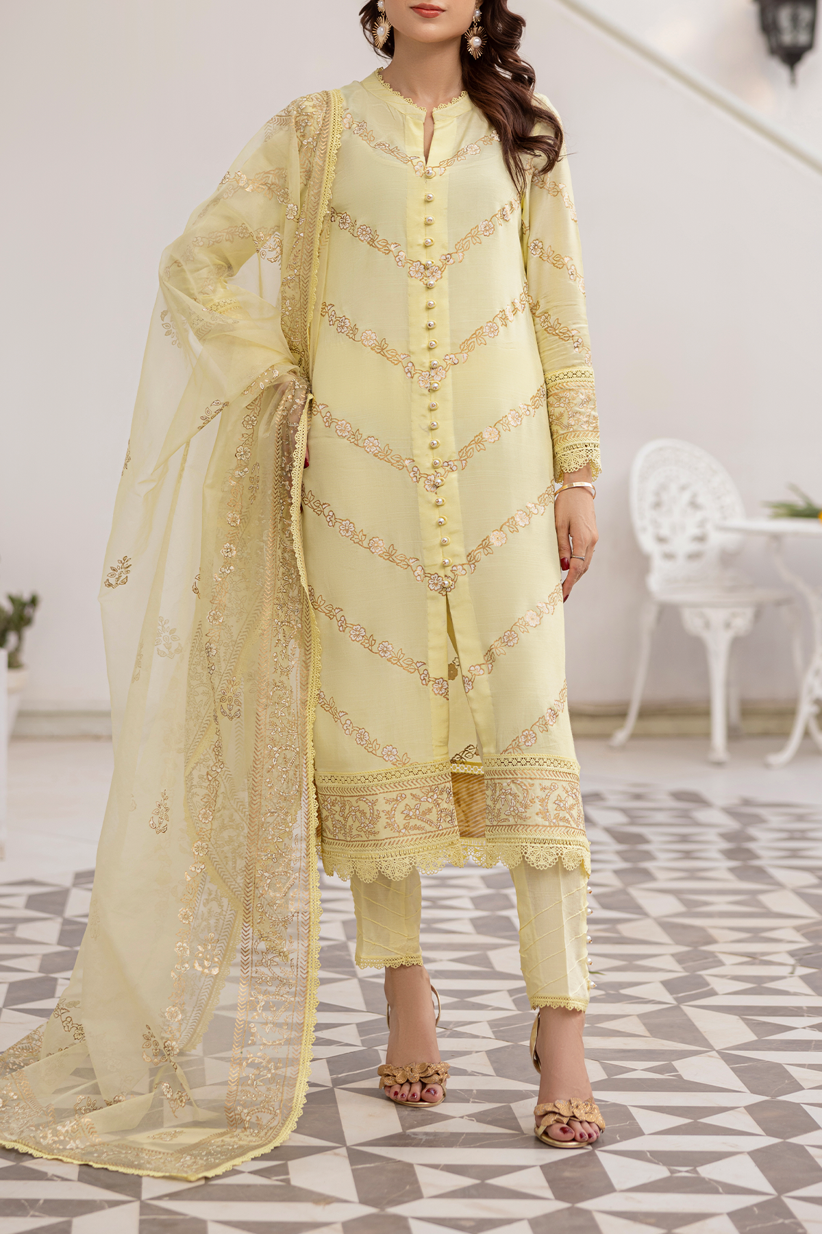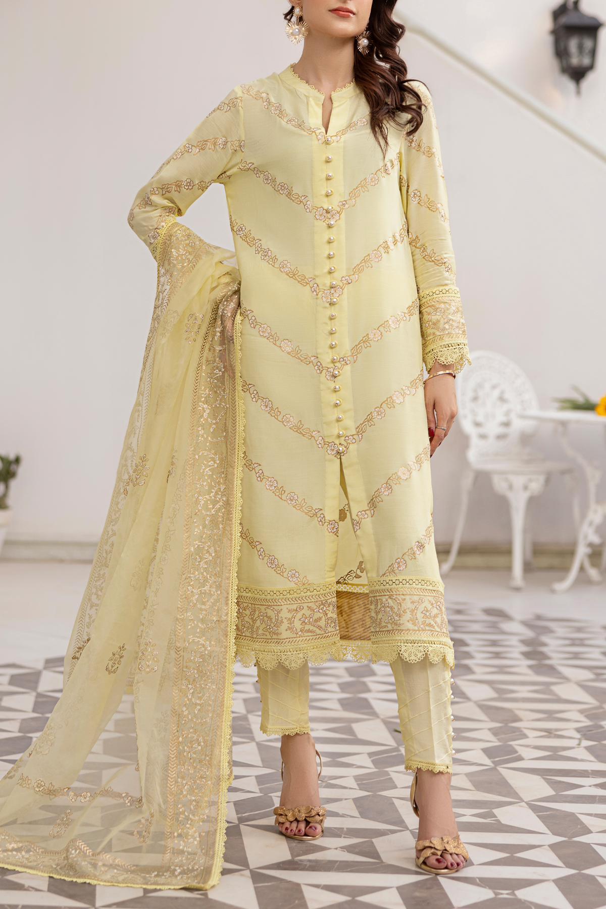 A stunning light yellow ensemble with ivory and gold block print. The long shirt paired with matching trousers exudes grace and style, while the beautiful dupatta adds a touch of refinement. This 3-piece unstitched outfit provides the freedom to tailor and style according to personal preferences.
