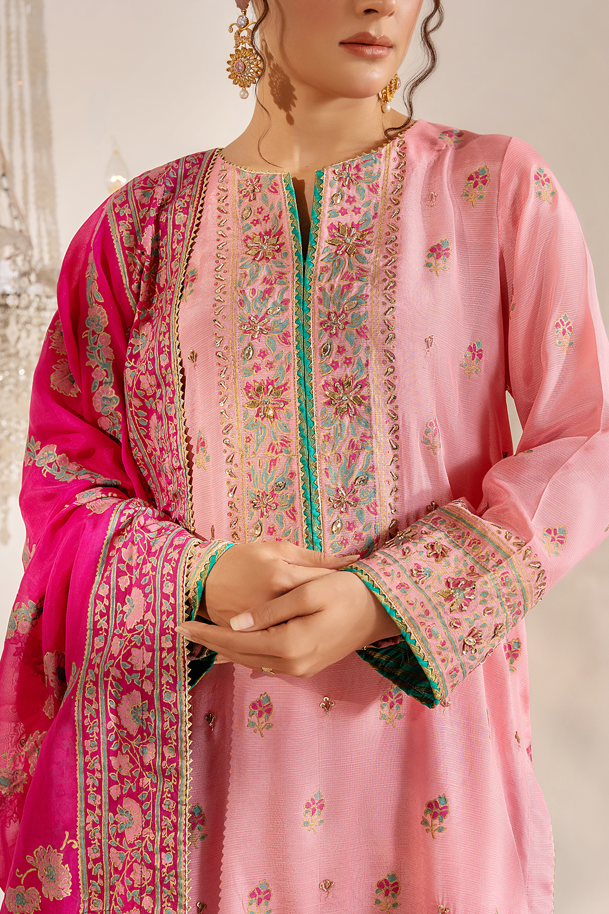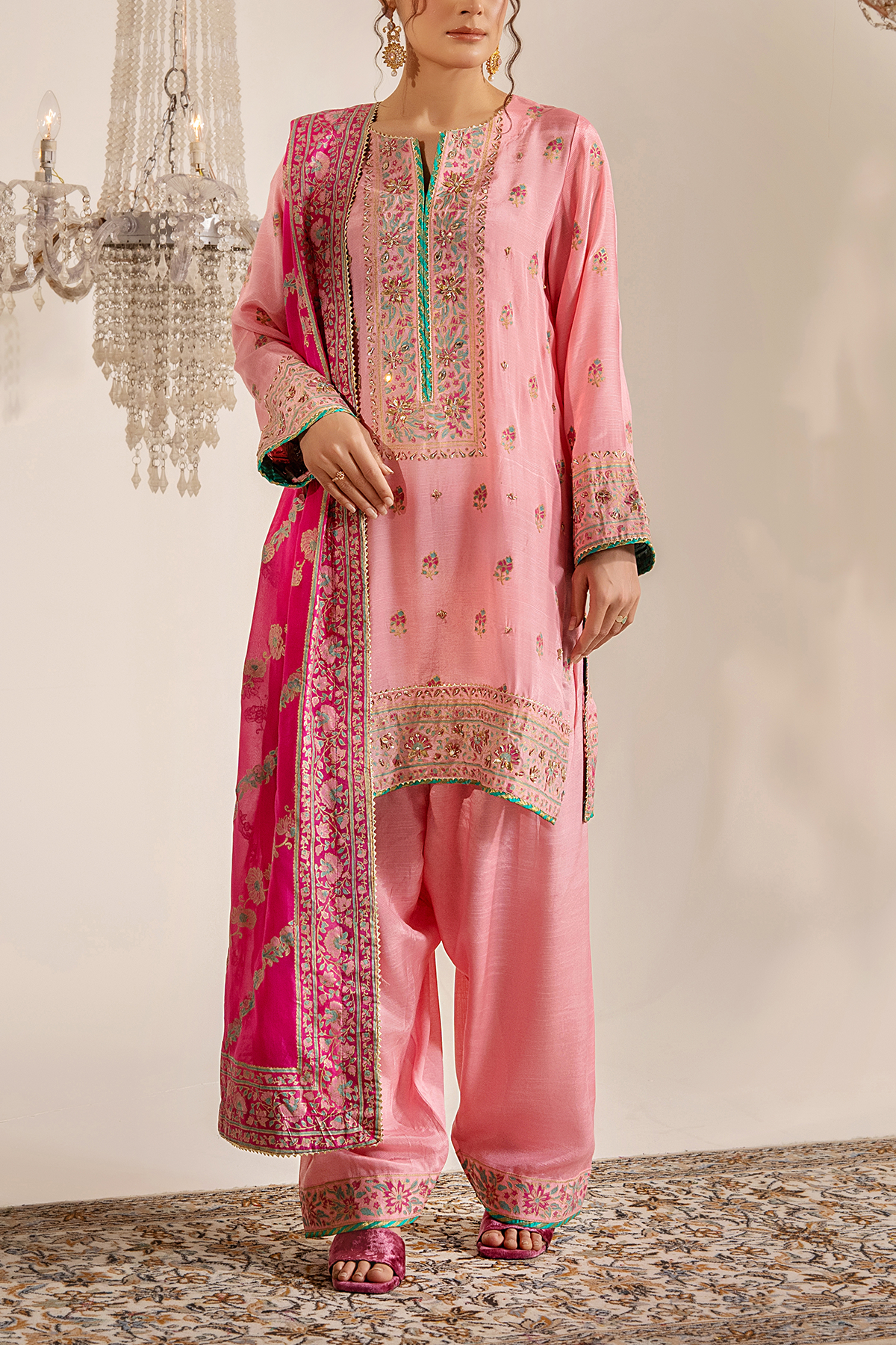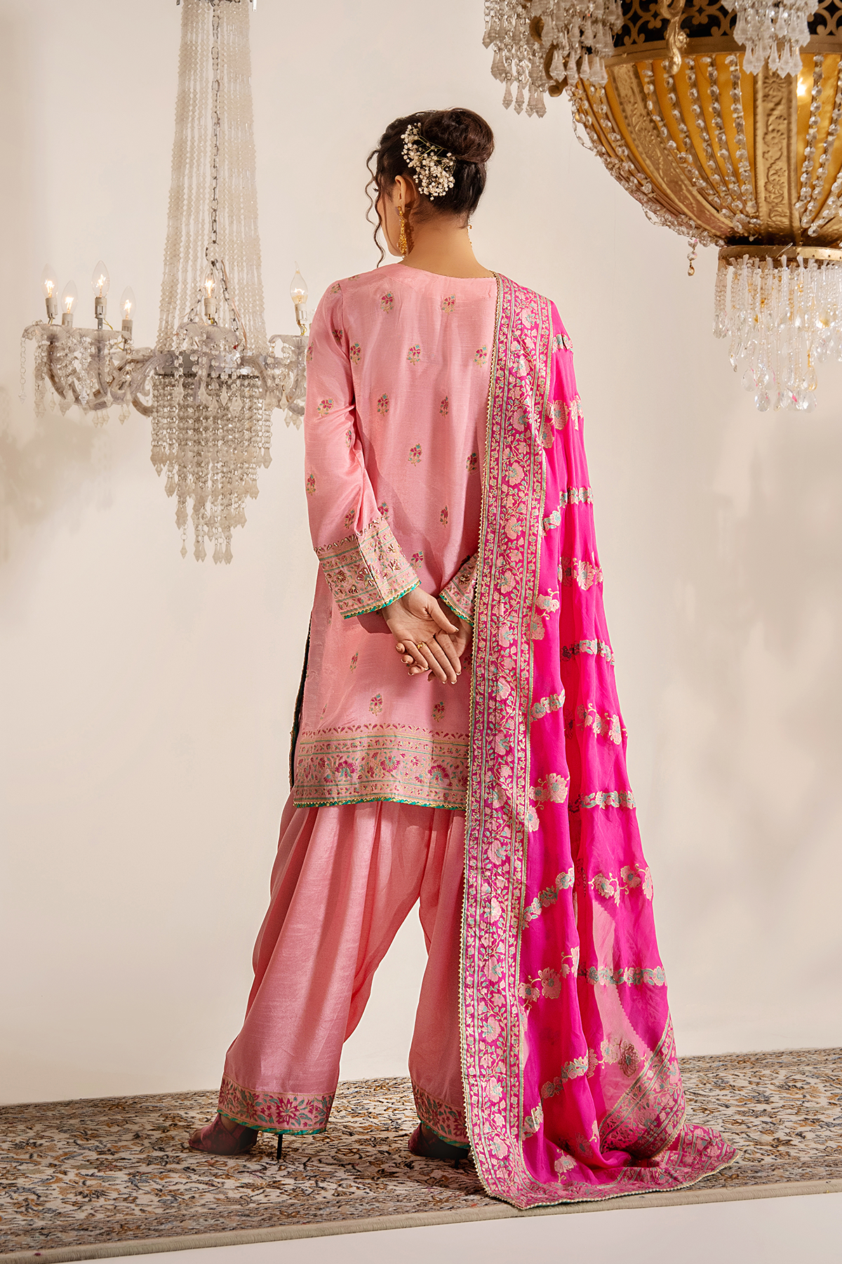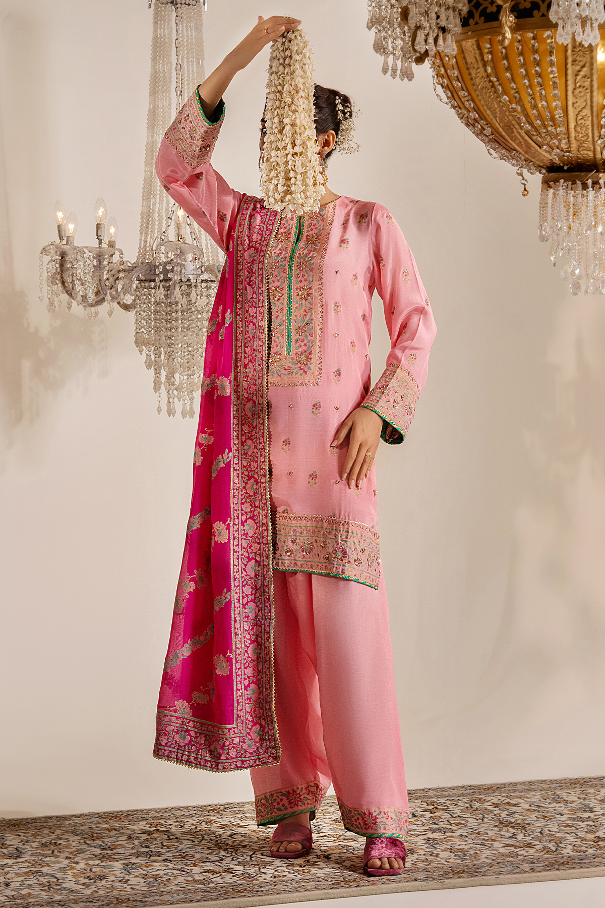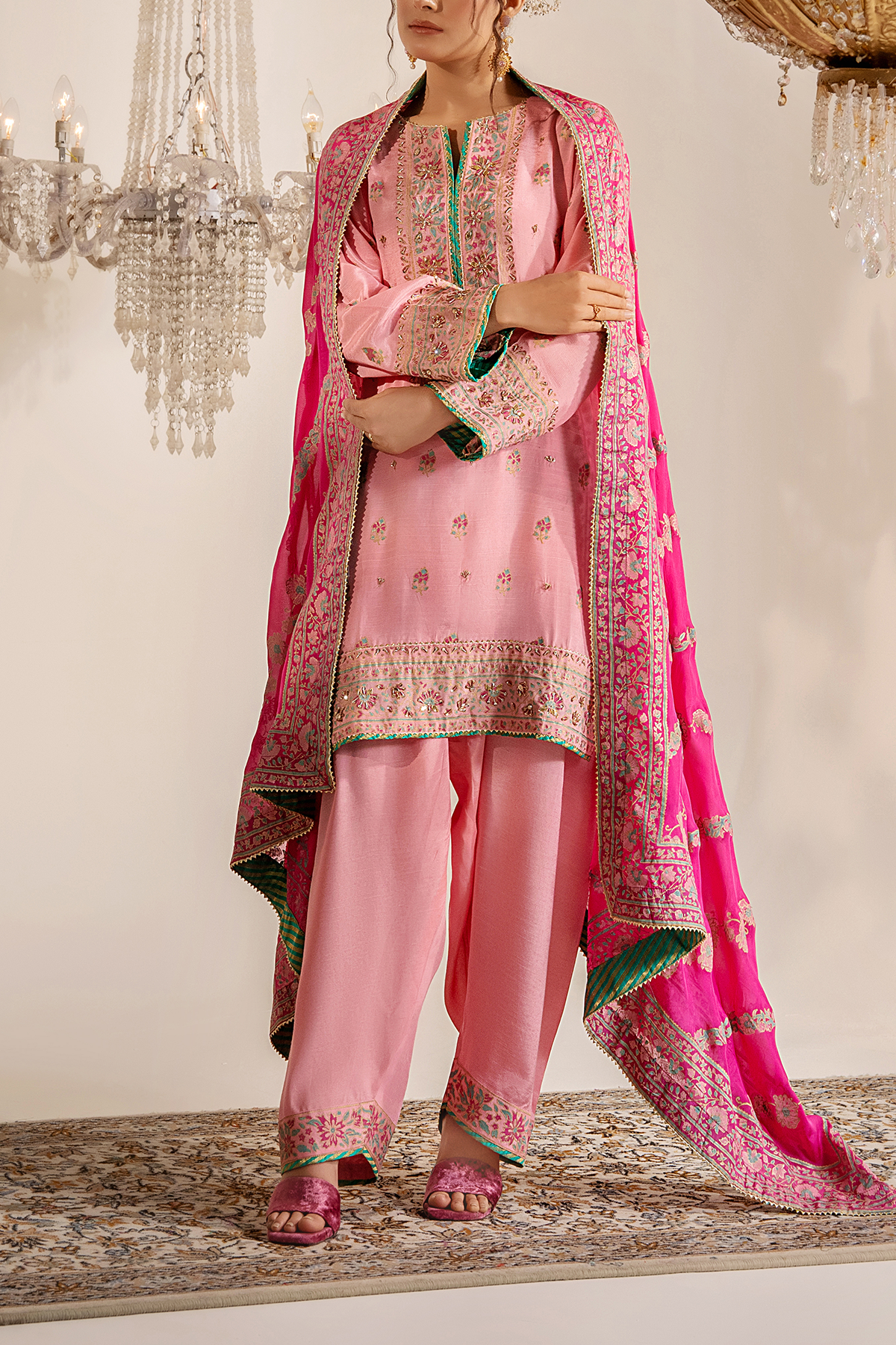 A blush pink vision crafted with delicate block print and adorned in exquisite Kora Naqshi, Kundan, and shimmering Gota work. Paired with a vibrant fuchsia dupatta blooming in intricate detailing.
