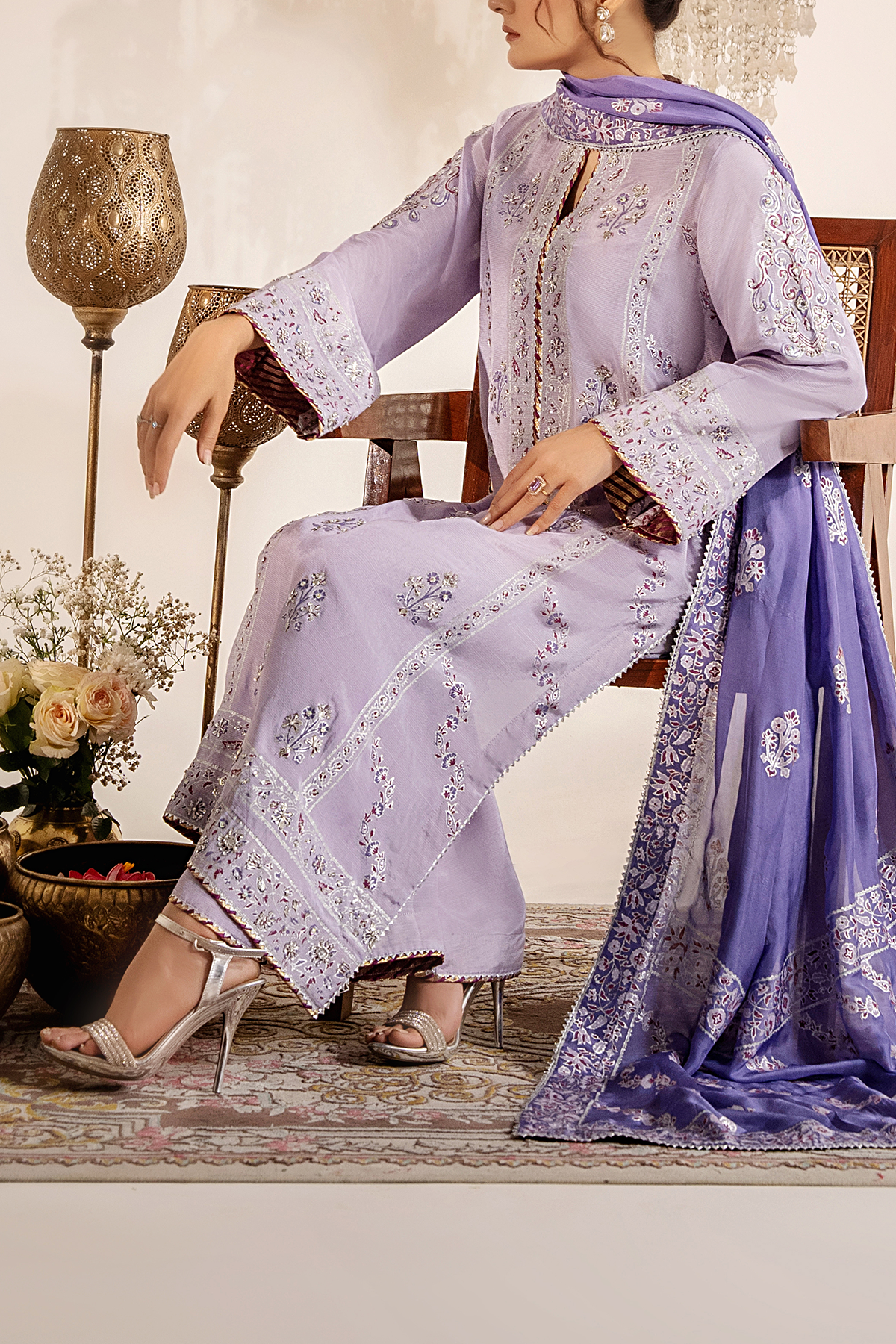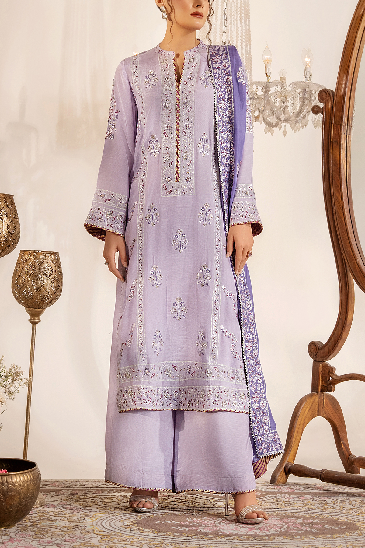 A dreamy lavender ensemble adorned with delicate silver and lilac block print, radiating subtle charm and ethereal grace. Paired with a dupatta in contrasting color. Featuring intricate threadwork, and beautifully finished with Kora Naqshi, Kundan, and Gota work for a festive statement.