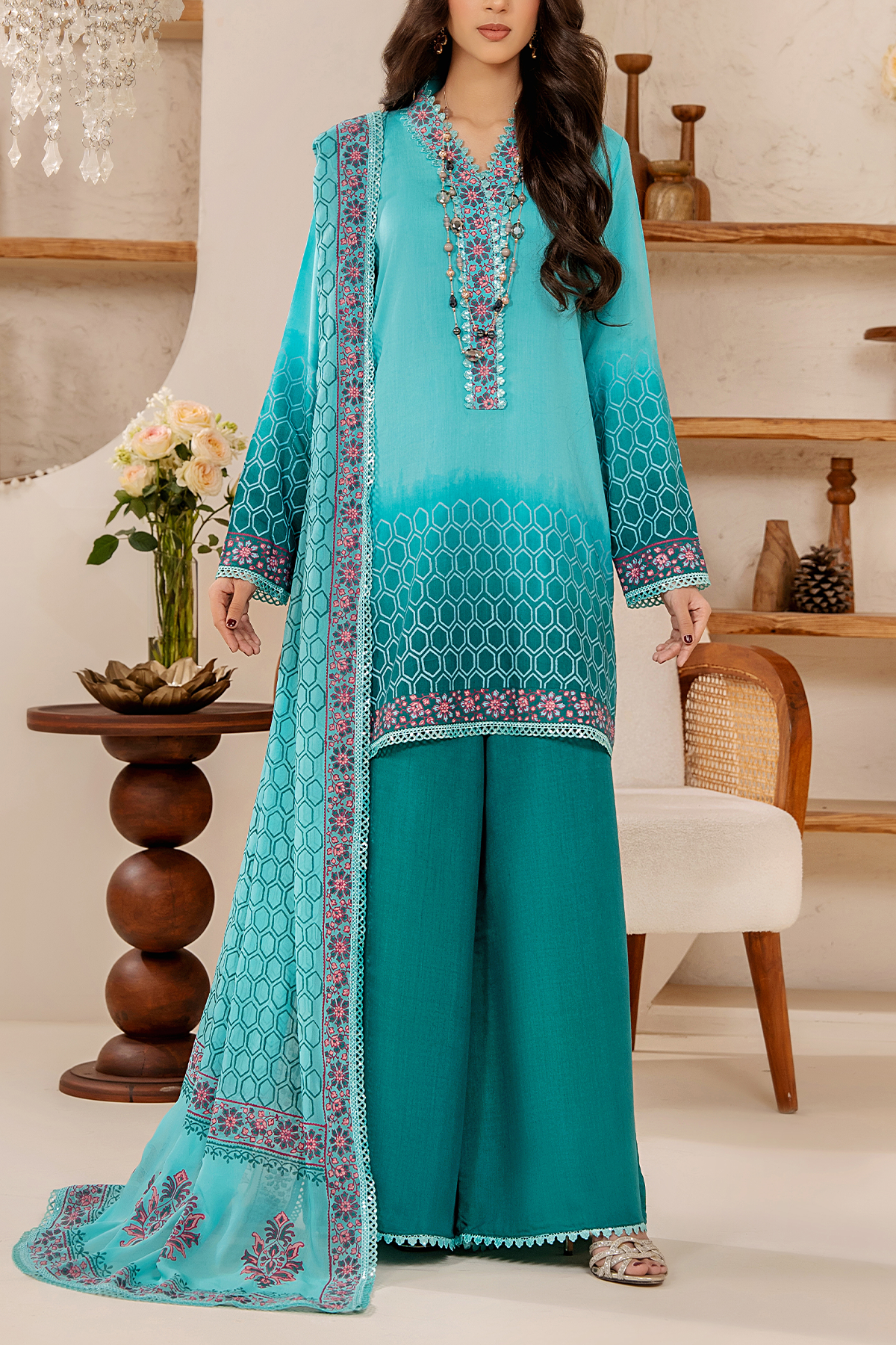 Dive into bold serenity — a teal ombré shirt with intricate block print, paired with wide-leg trousers and a complementing chiffon dupatta. Cool tones with a classic twist