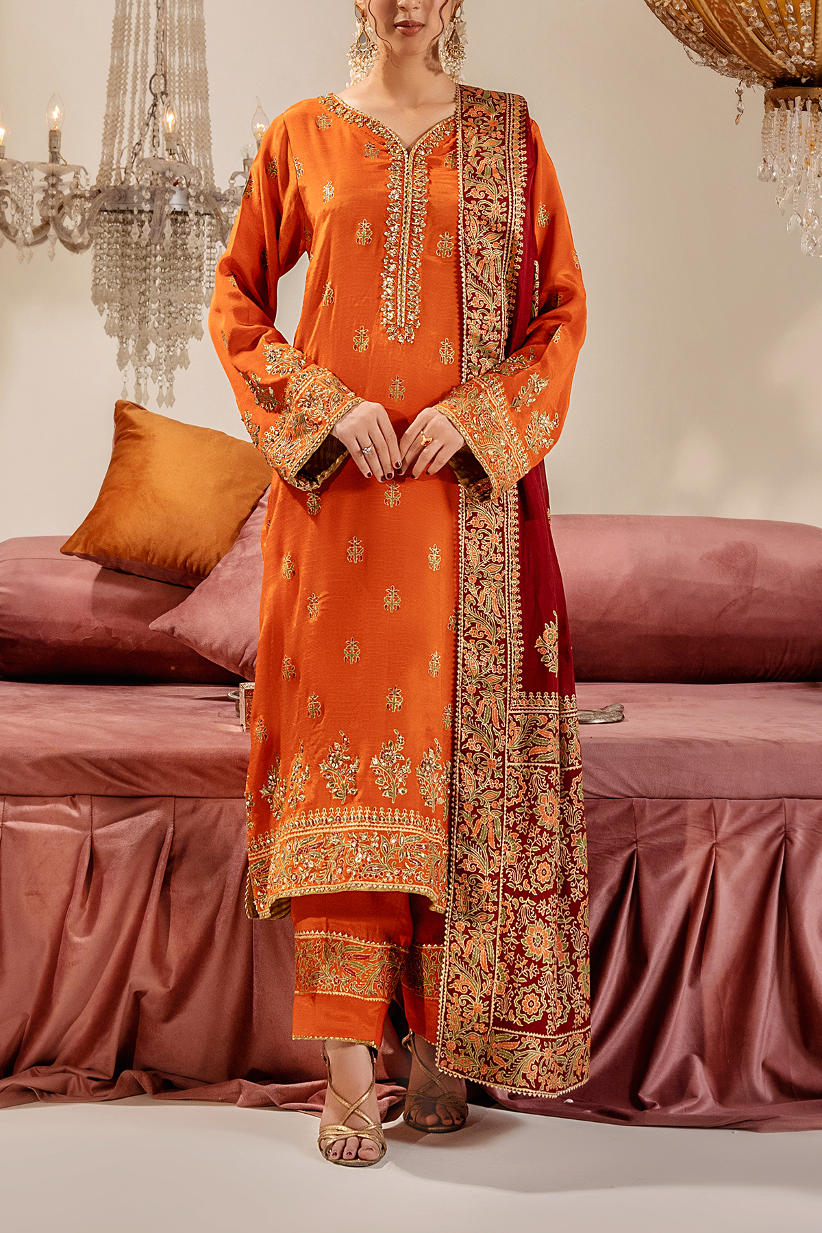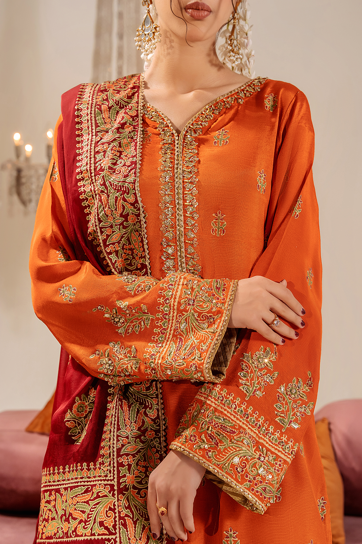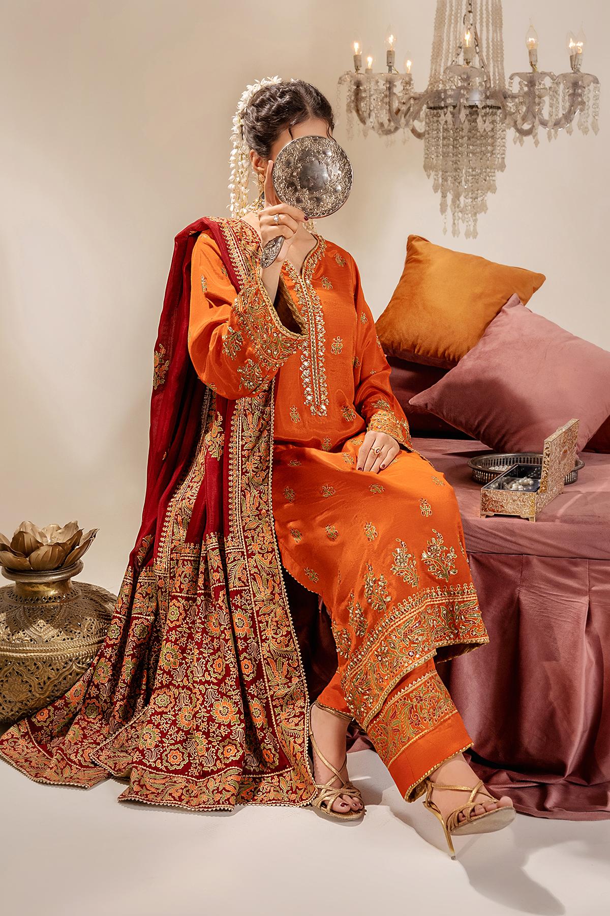 A vibrant orange outfit brought to life through the delicate charm of hand block printing. The rich maroon dupatta, drenched in elaborate florals and paisley inspired prints, adds a regal contrast, wrapping the look in quiet luxury. Finished with intricate Kora Naqshi, Kundan, and Gota work.