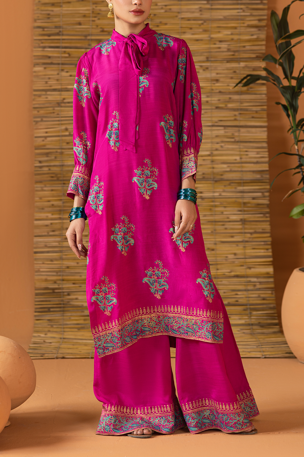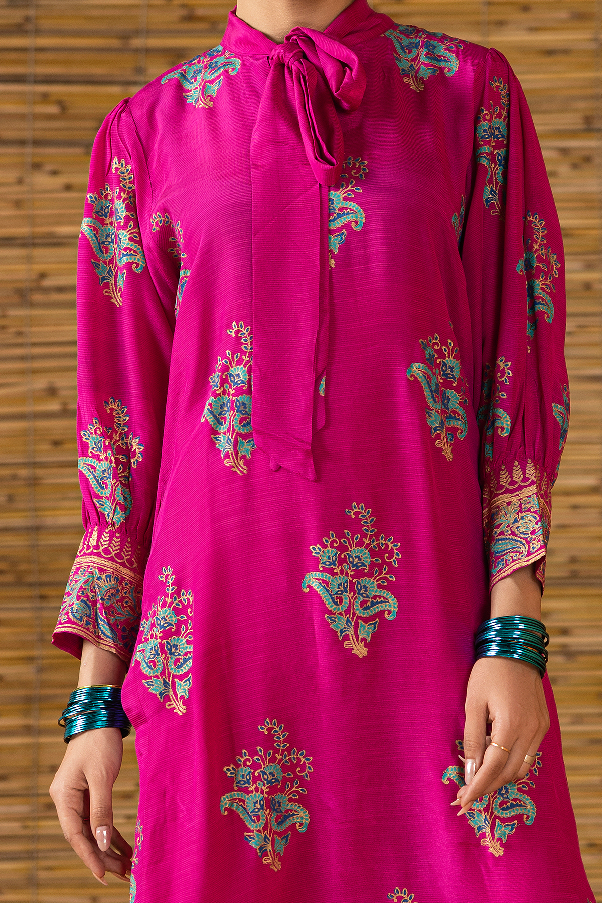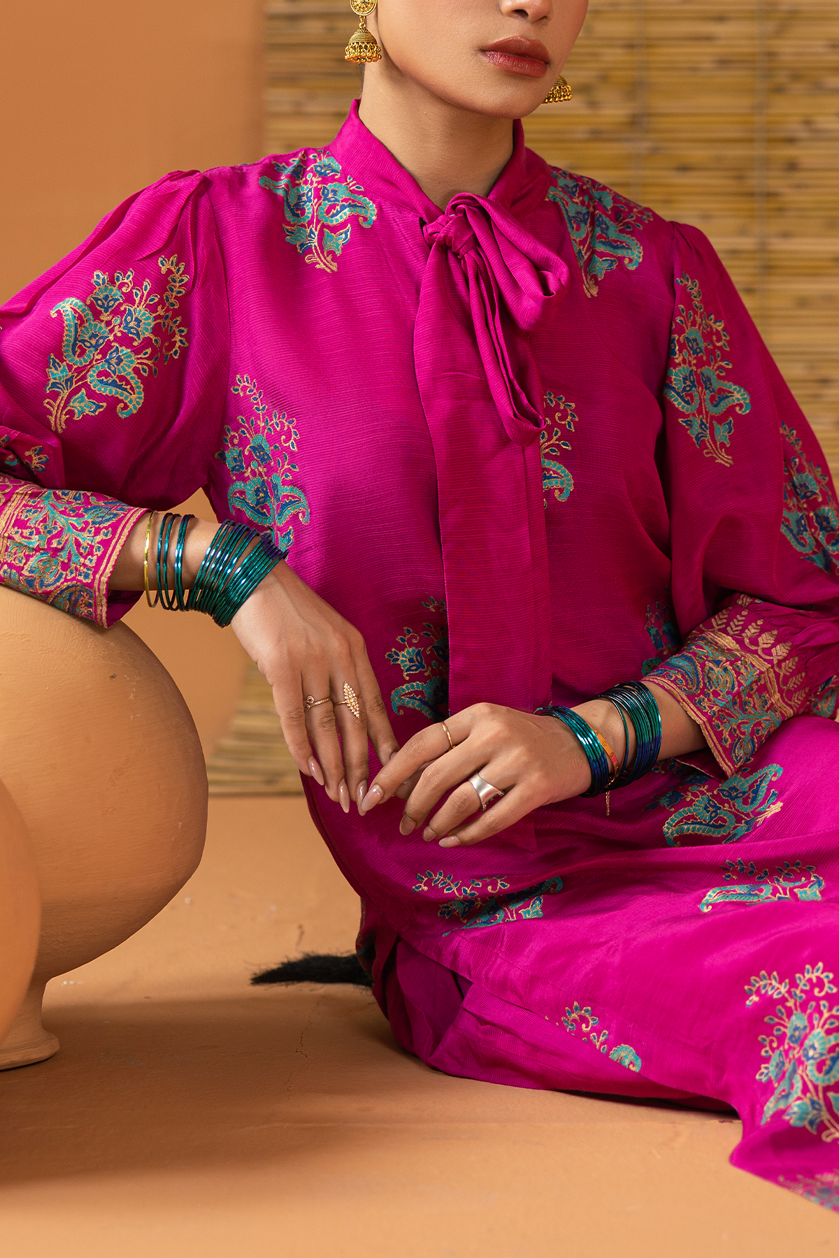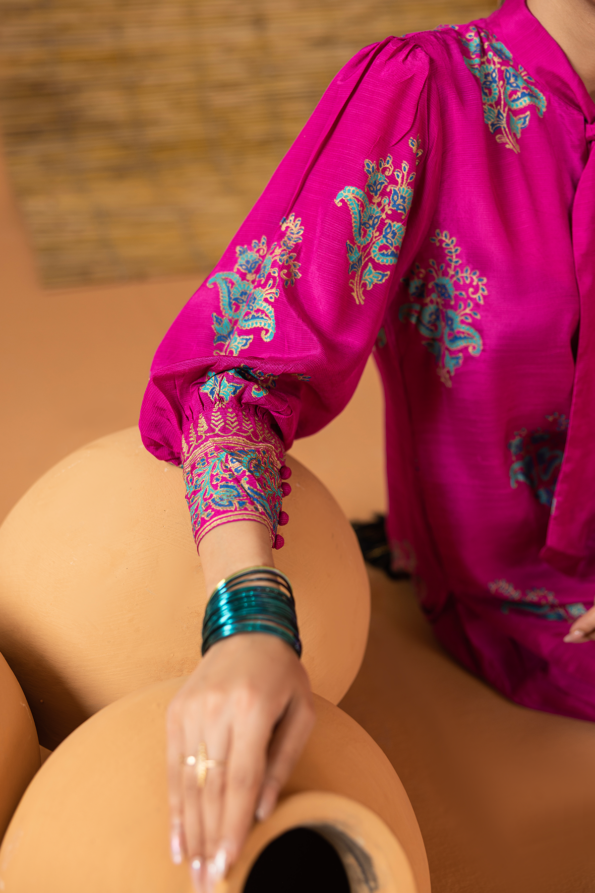A vibrant unstitched outfit in a striking fuchsia shade, embellished with intricate block prints in delicate teal and gold accents. The outfit features an elegant border and a refined bow tie neckline, adding a modern touch to traditional craftsmanship. Perfect for festive occasions where style meets tradition.