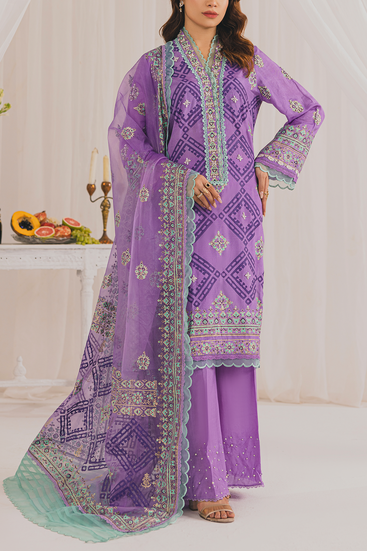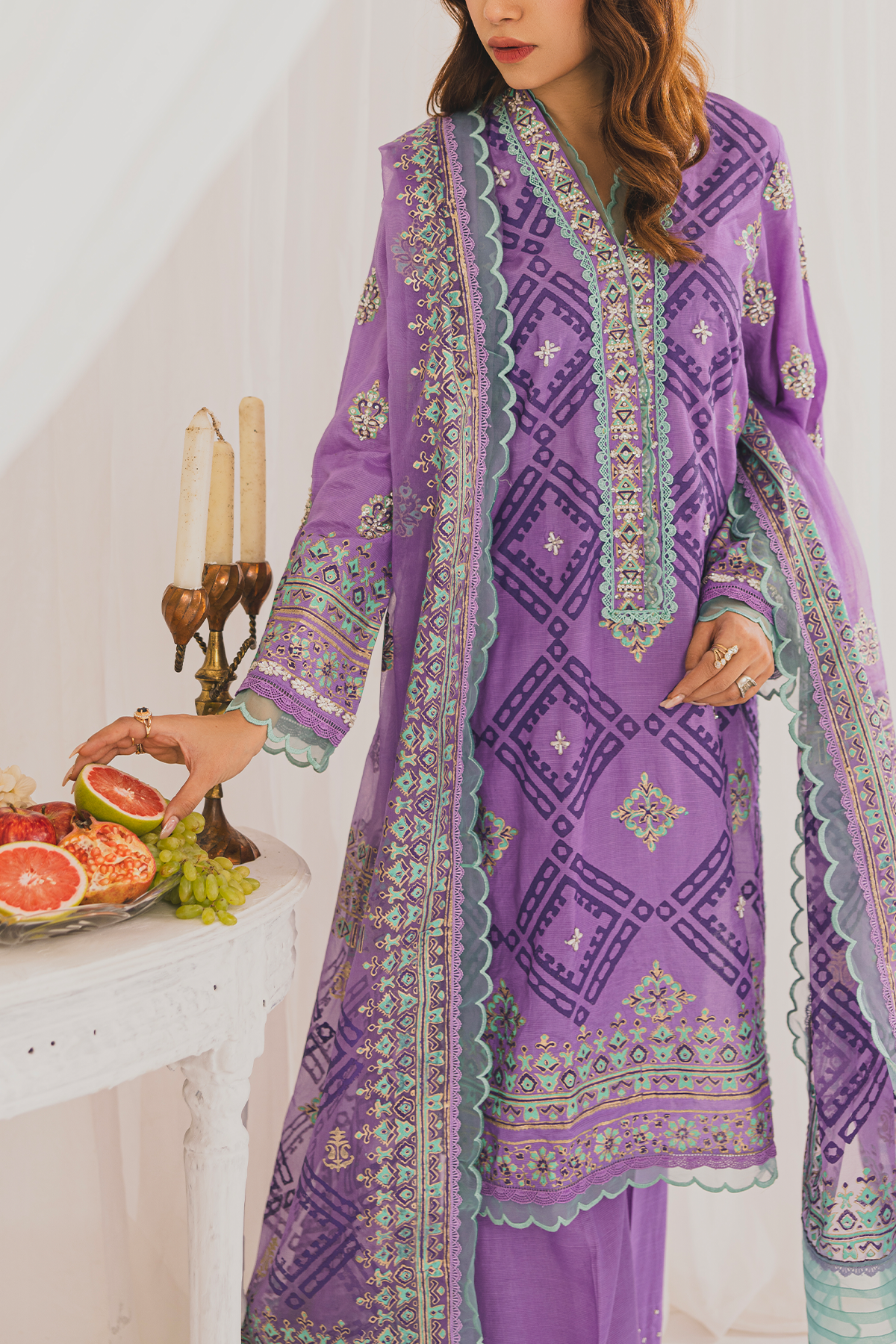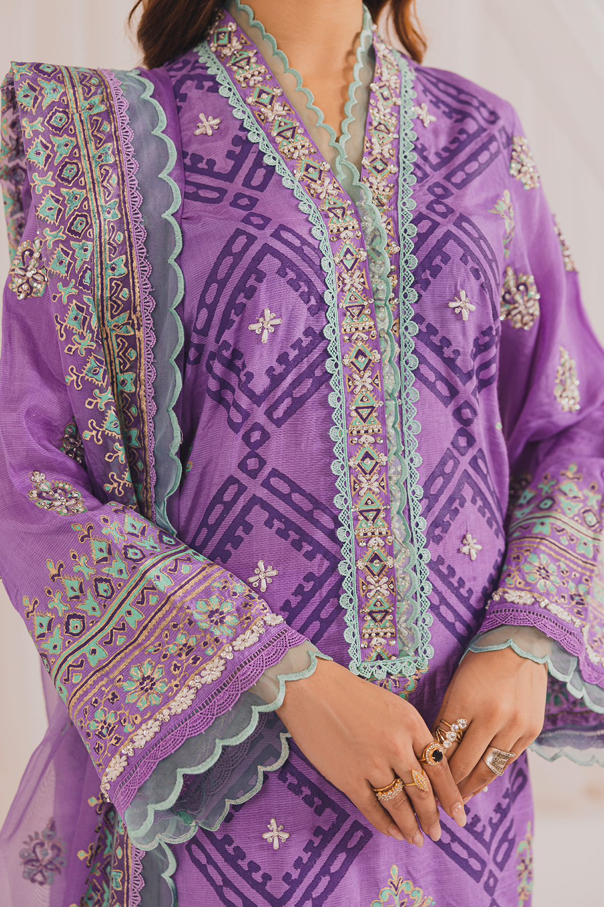 This unstitched outfit features vibrant lavender hues with delicate block printing, enhanced by intricate block printing and a scalloped border. The mint green accents add a refreshing contrast, making it a charming choice for festive occasions.