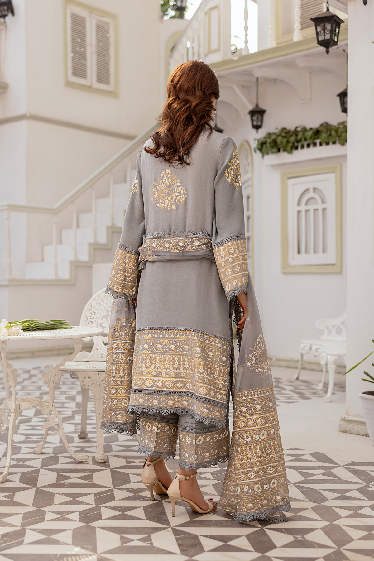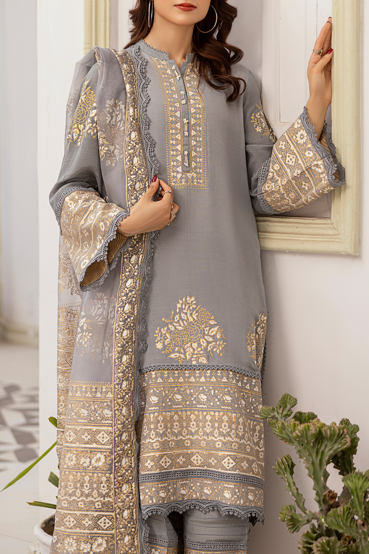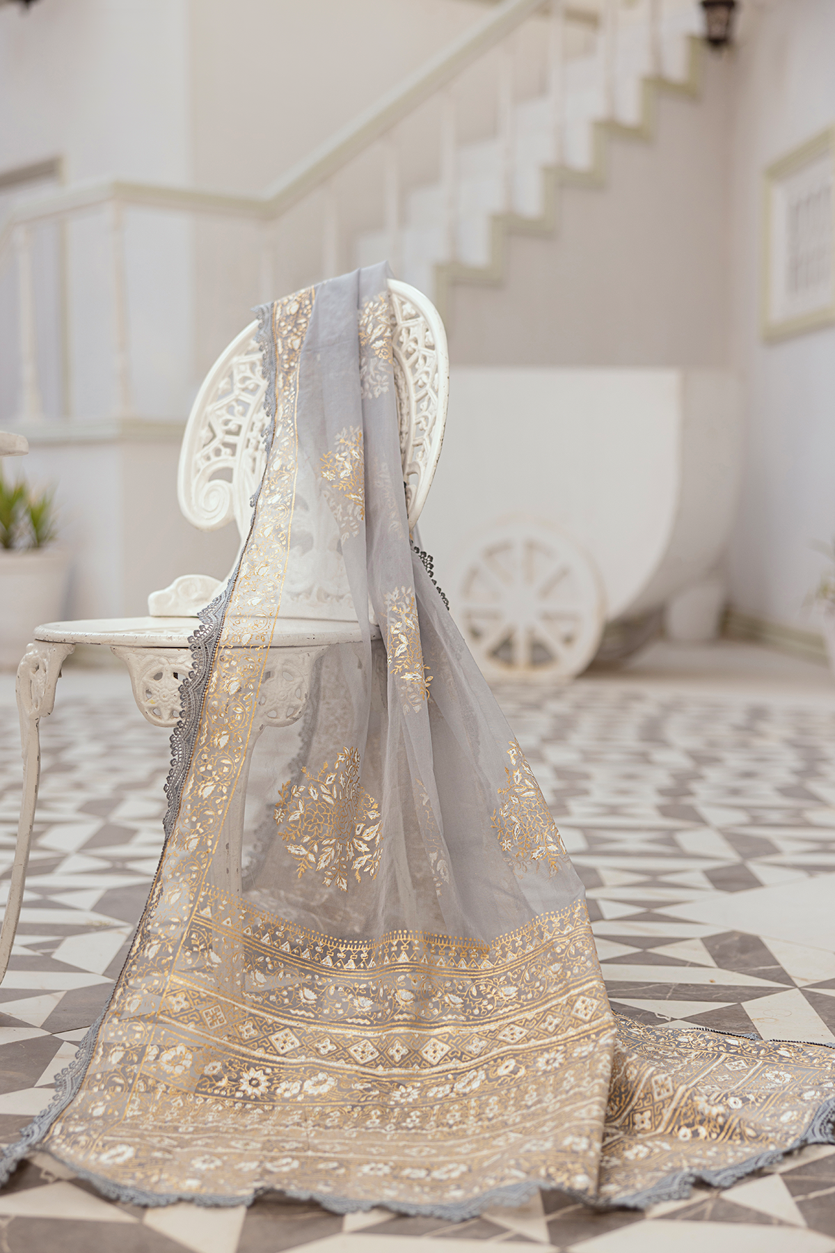 A 3-piece unstitched outfit designed to elevate your style with its chic gray hue and intricate ivory and golden hand block print. This stylish attire includes a shirt, matching pants, and a coordinating dupatta, combining modern flair with traditional charm to create a fashion-forward look that is both versatile and eye-catching.