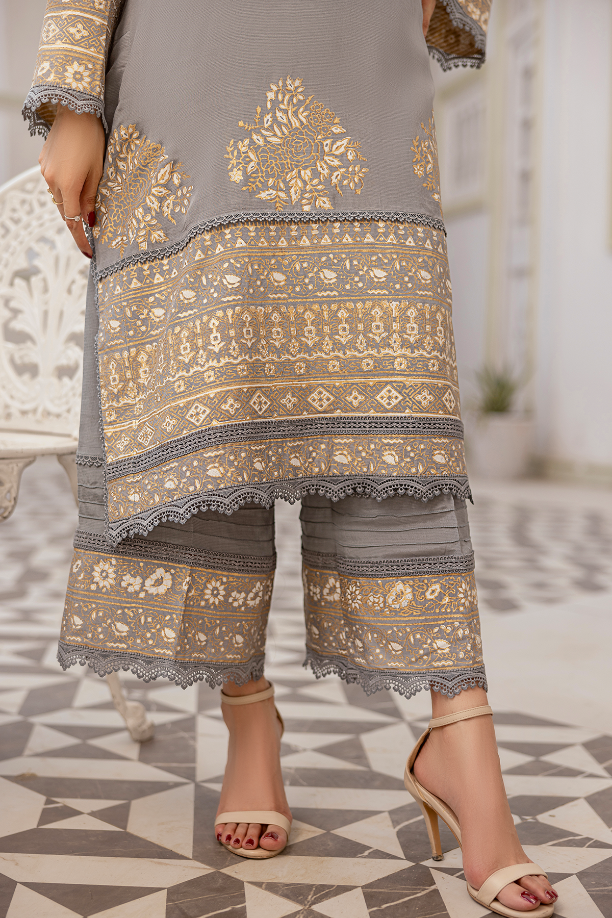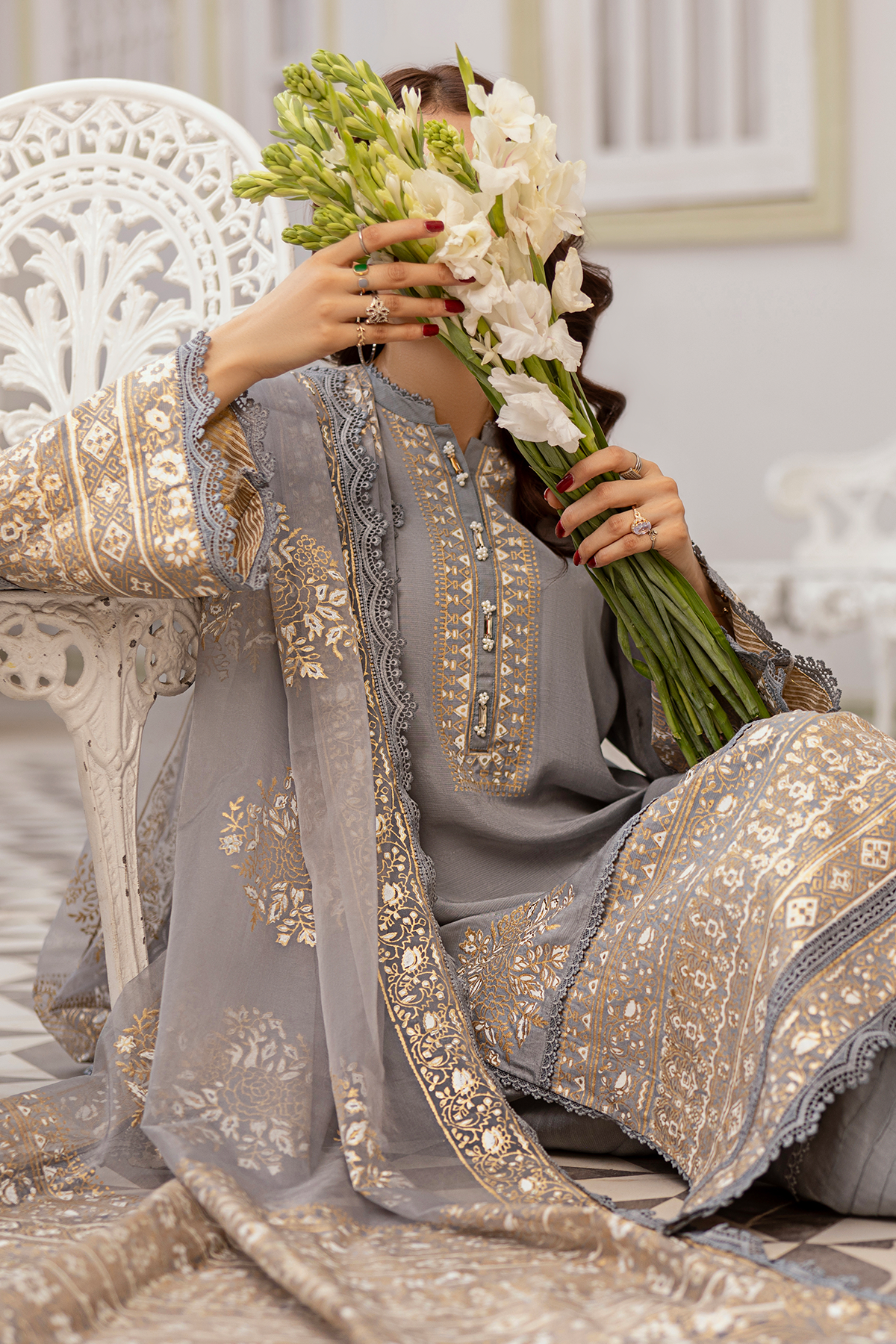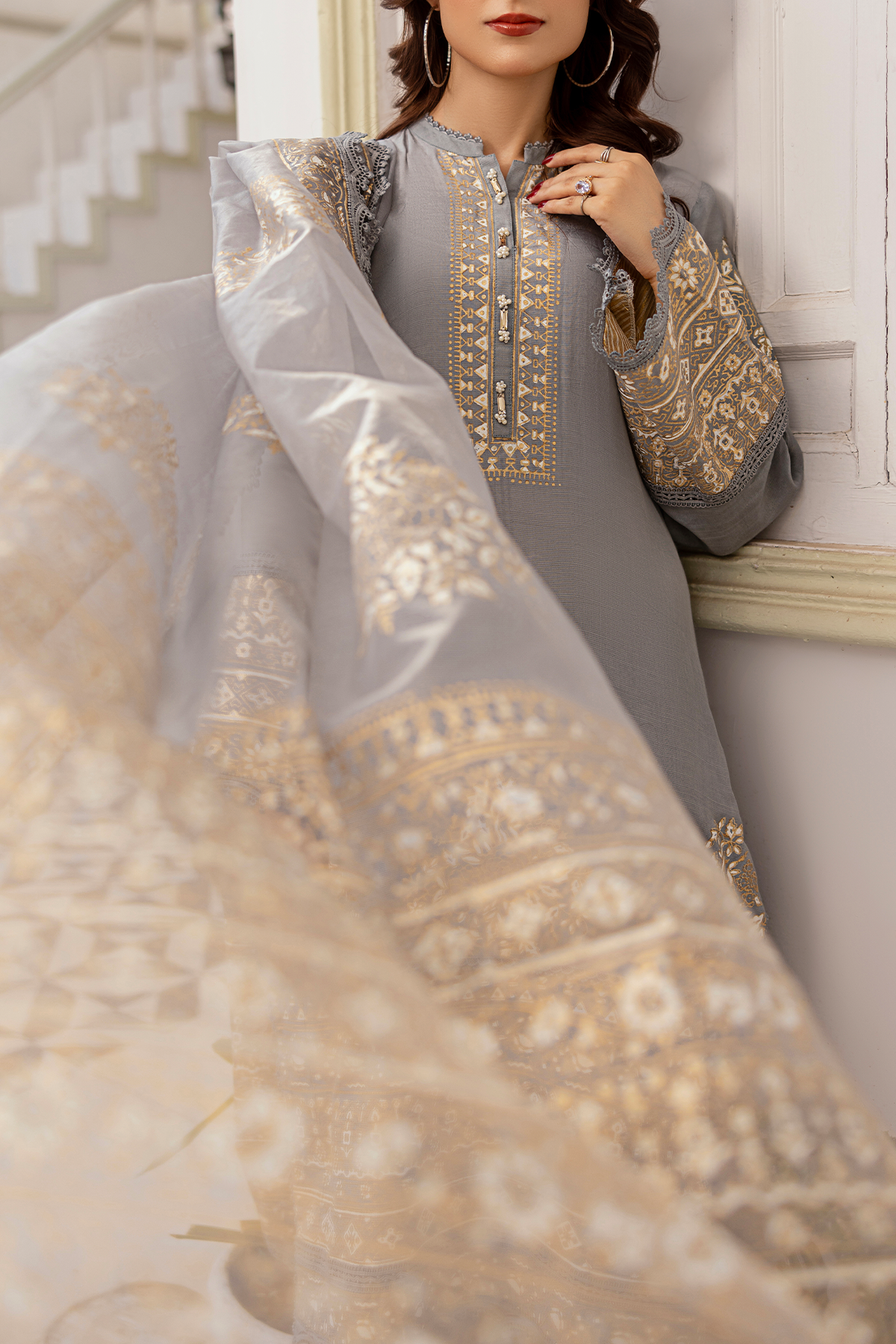 A 3-piece unstitched outfit designed to elevate your style with its chic gray hue and intricate ivory and golden hand block print. This stylish attire includes a shirt, matching pants, and a coordinating dupatta, combining modern flair with traditional charm to create a fashion-forward look that is both versatile and eye-catching.