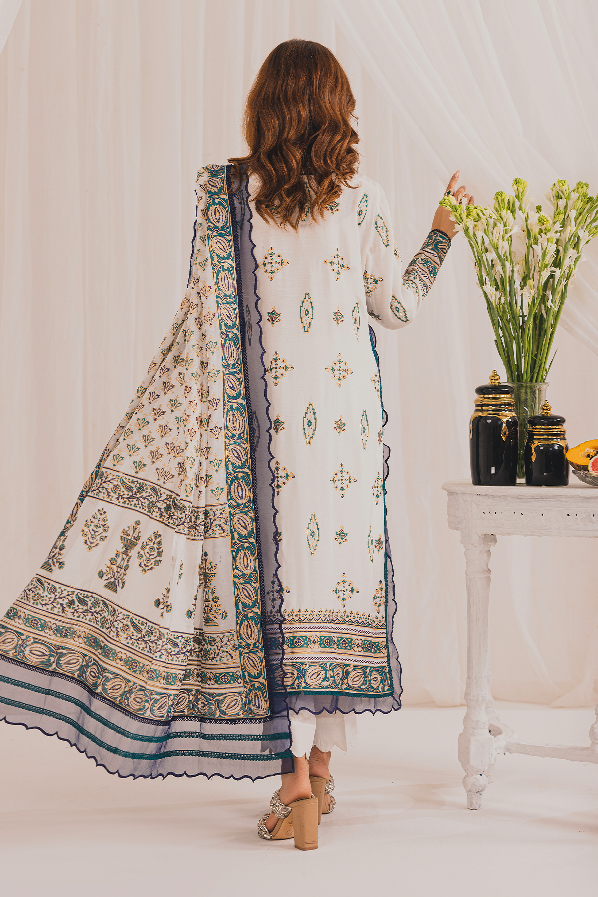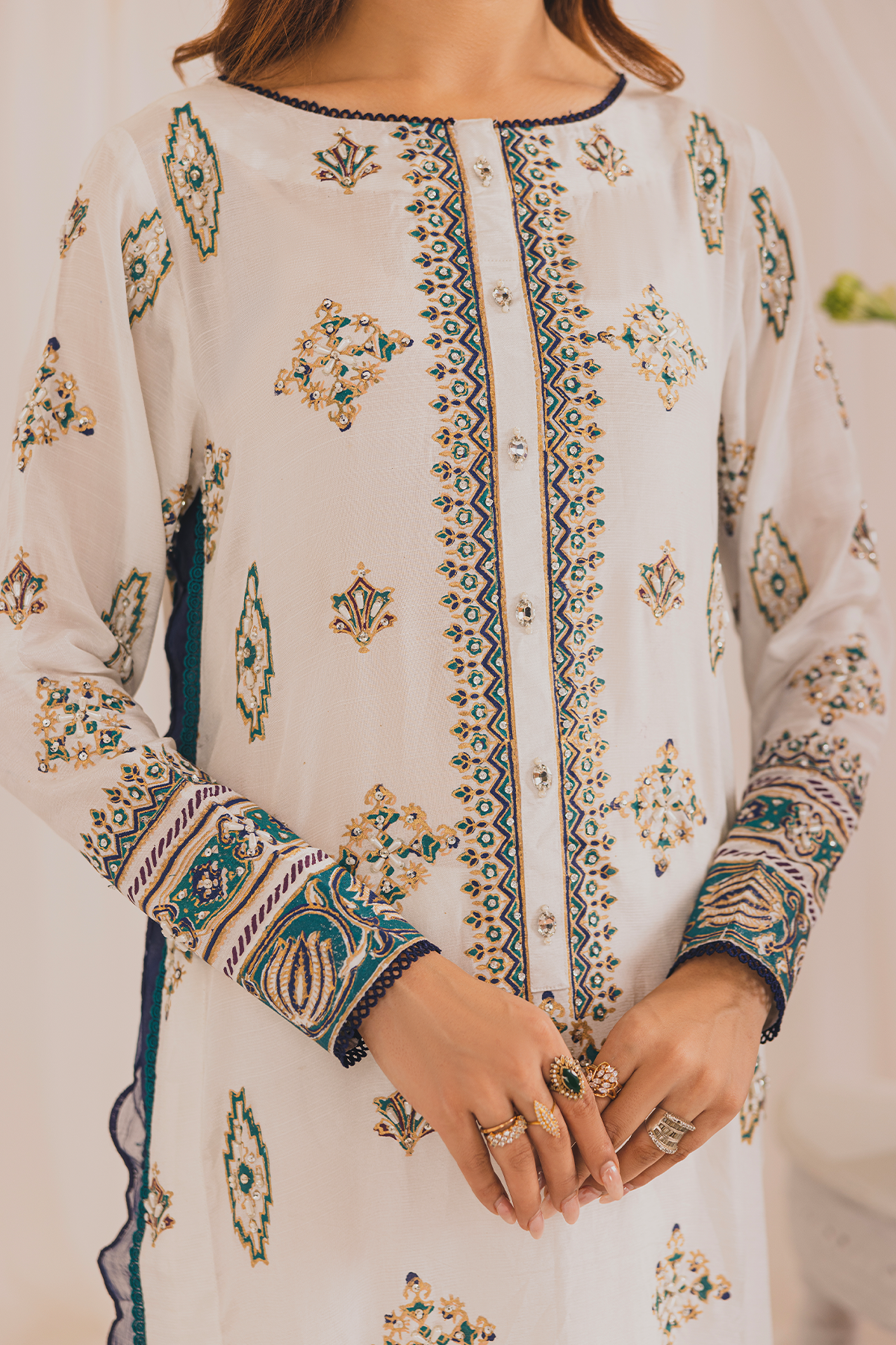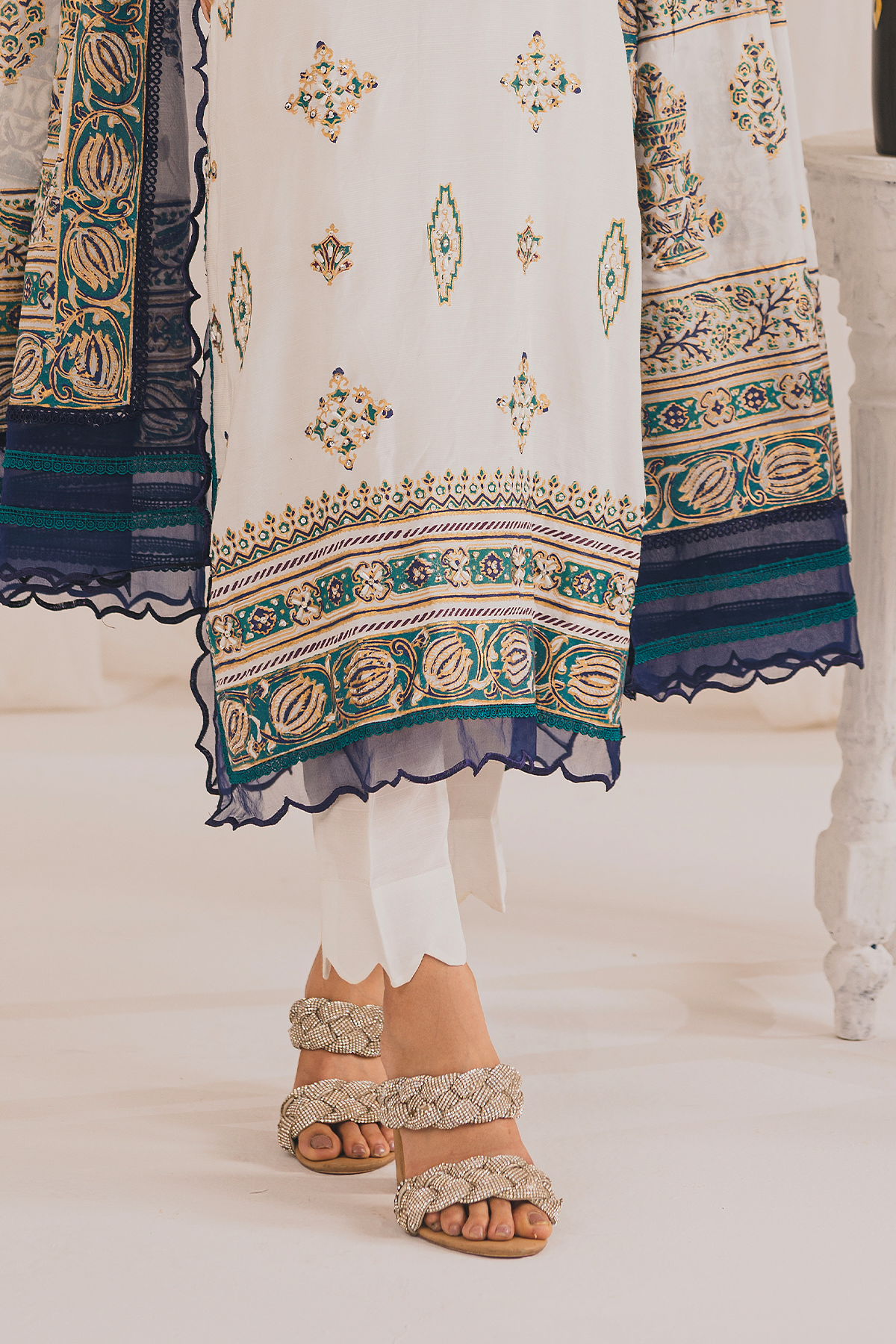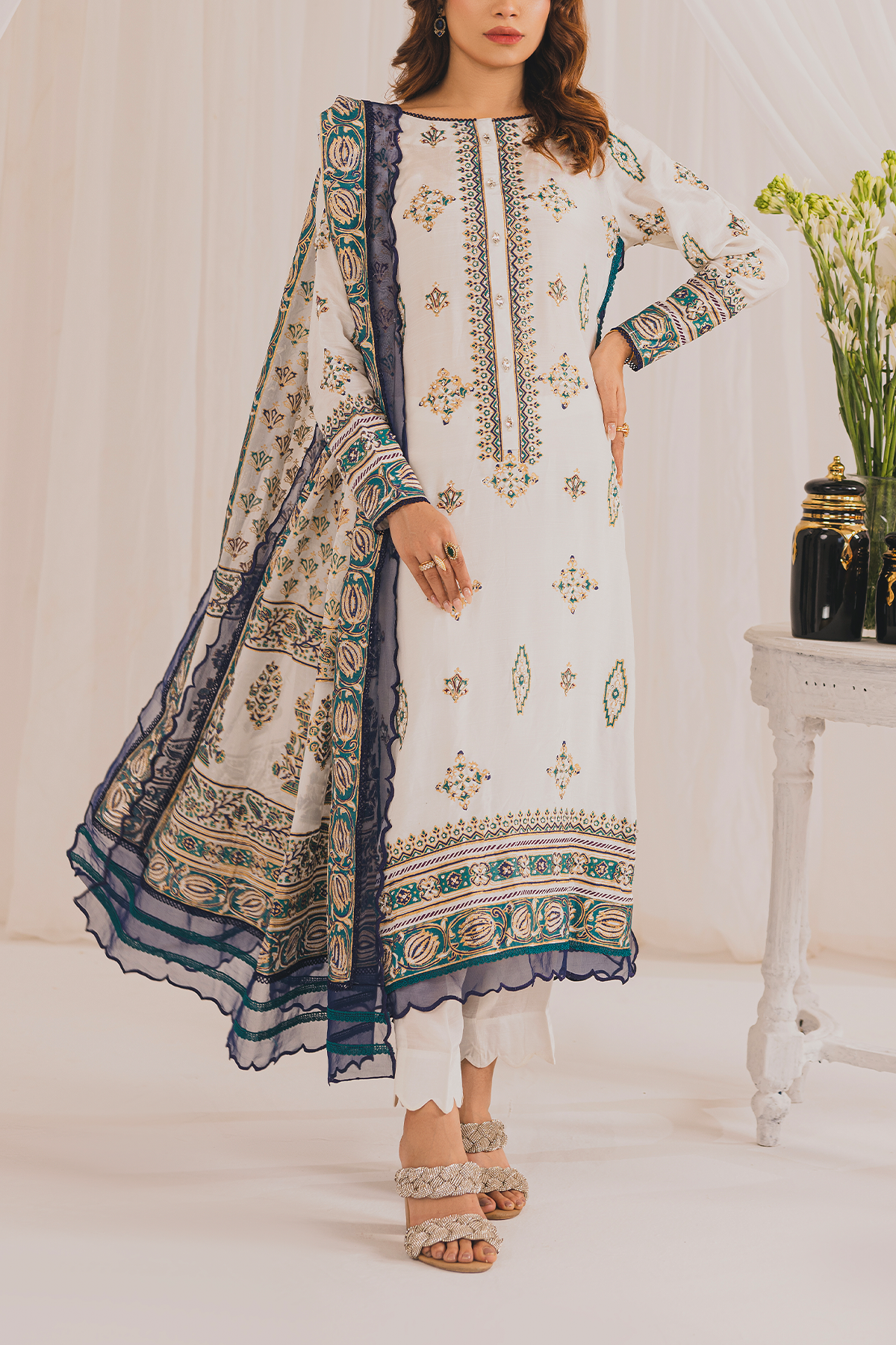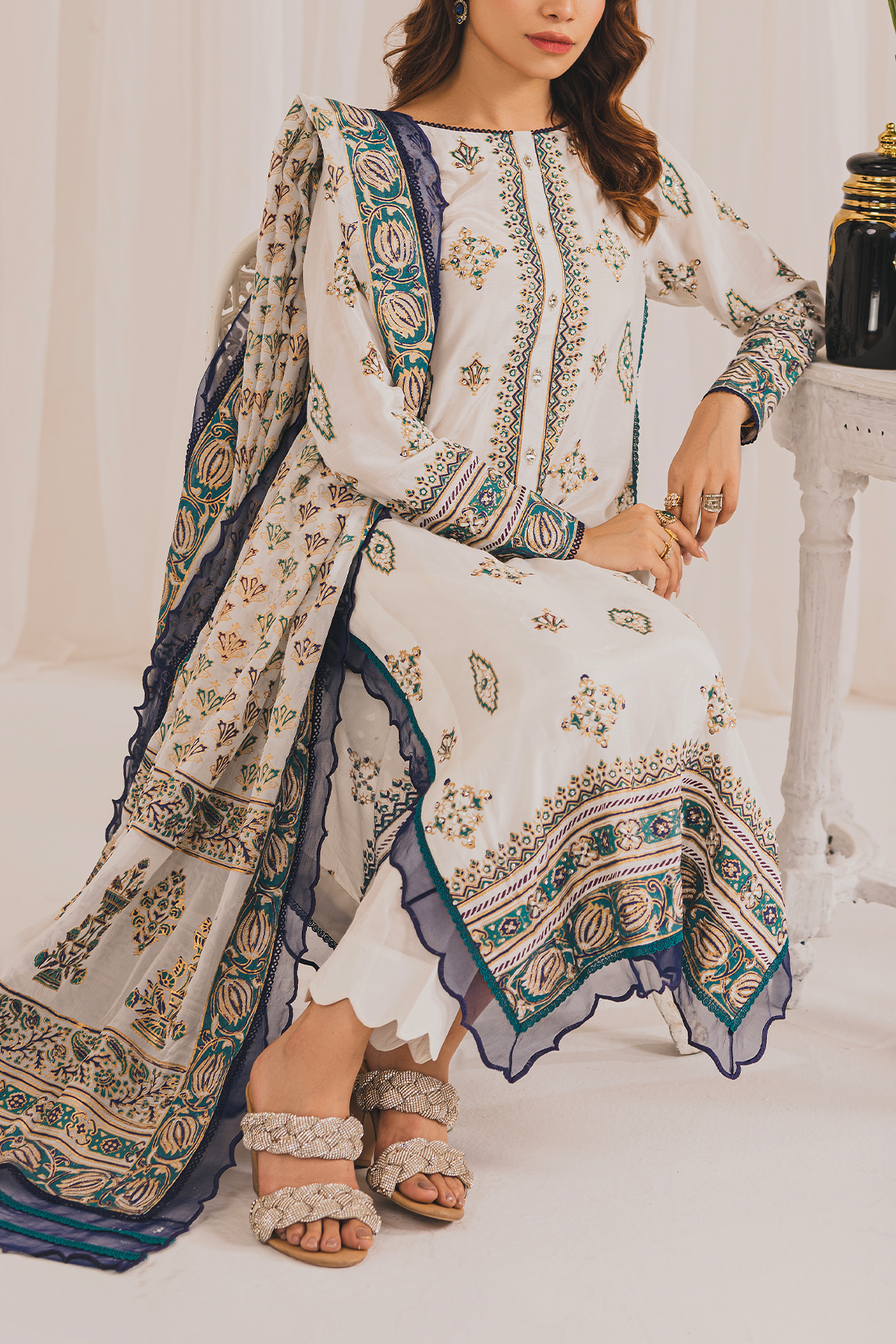 This unstitched outfit showcases intricate block printing with delicate embellishments, vibrant borders, and a scalloped hem, offering a refined blend of tradition and style.