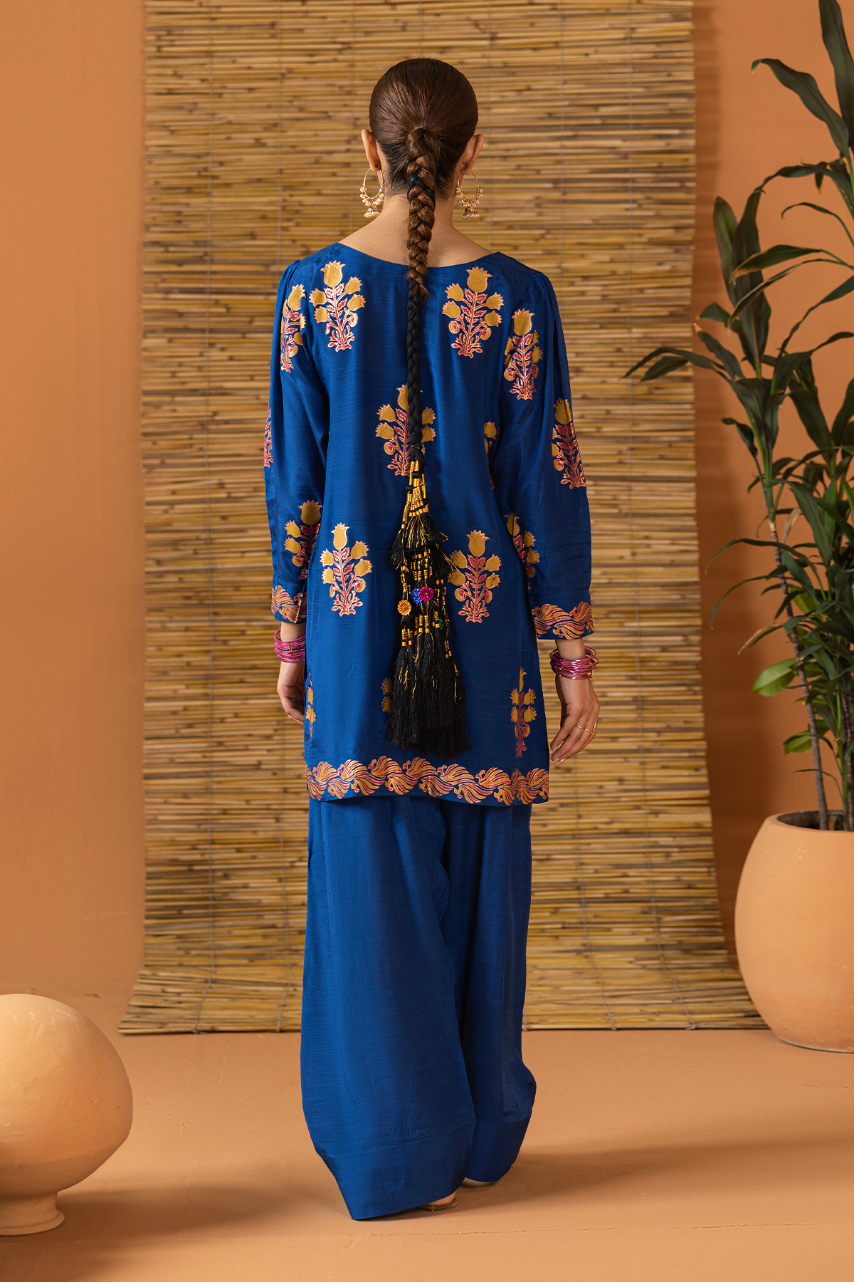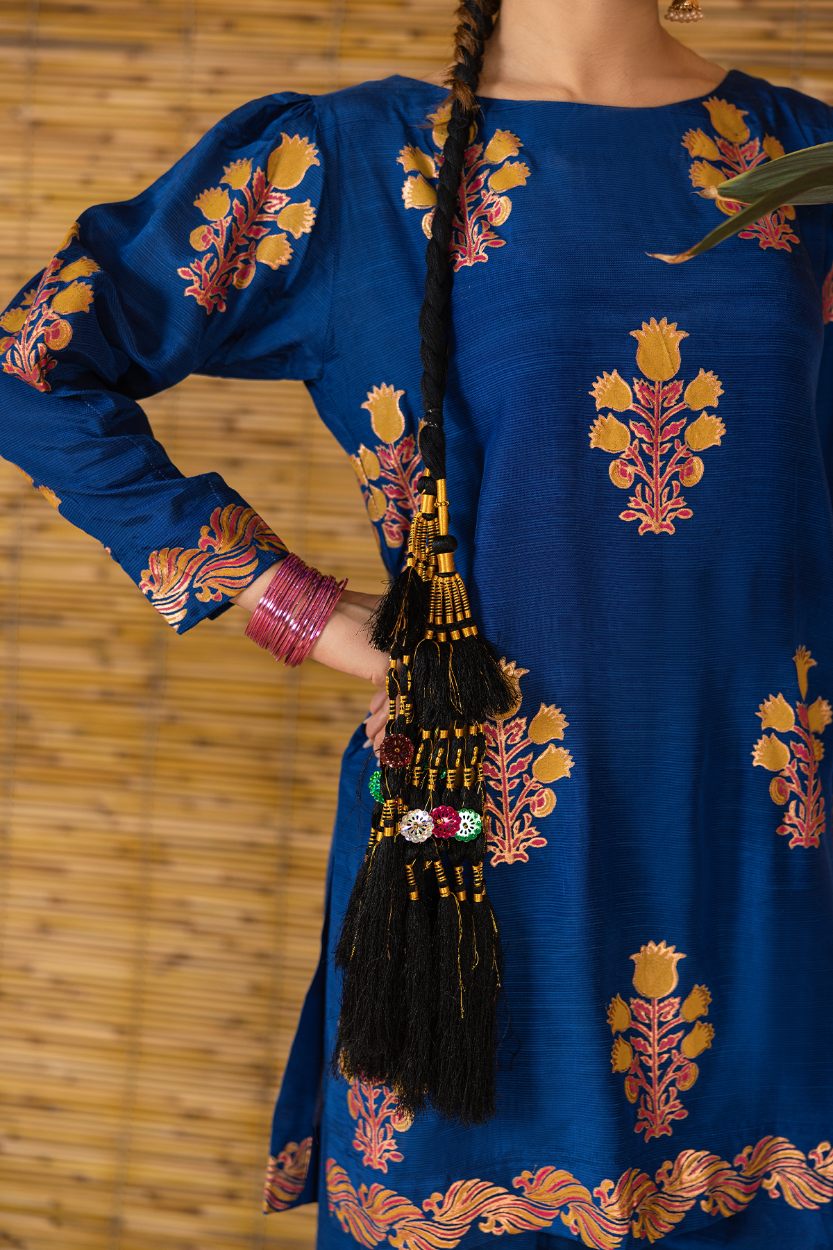 This elegant unstitched outfit features a striking deep blue base adorned with bold floral block prints in vibrant shades of mustard yellow and soft pink.