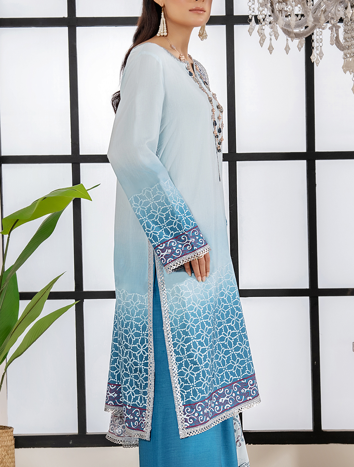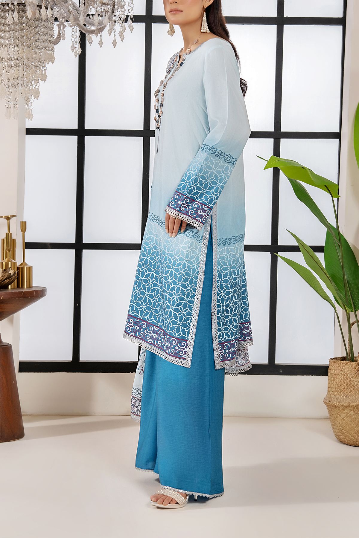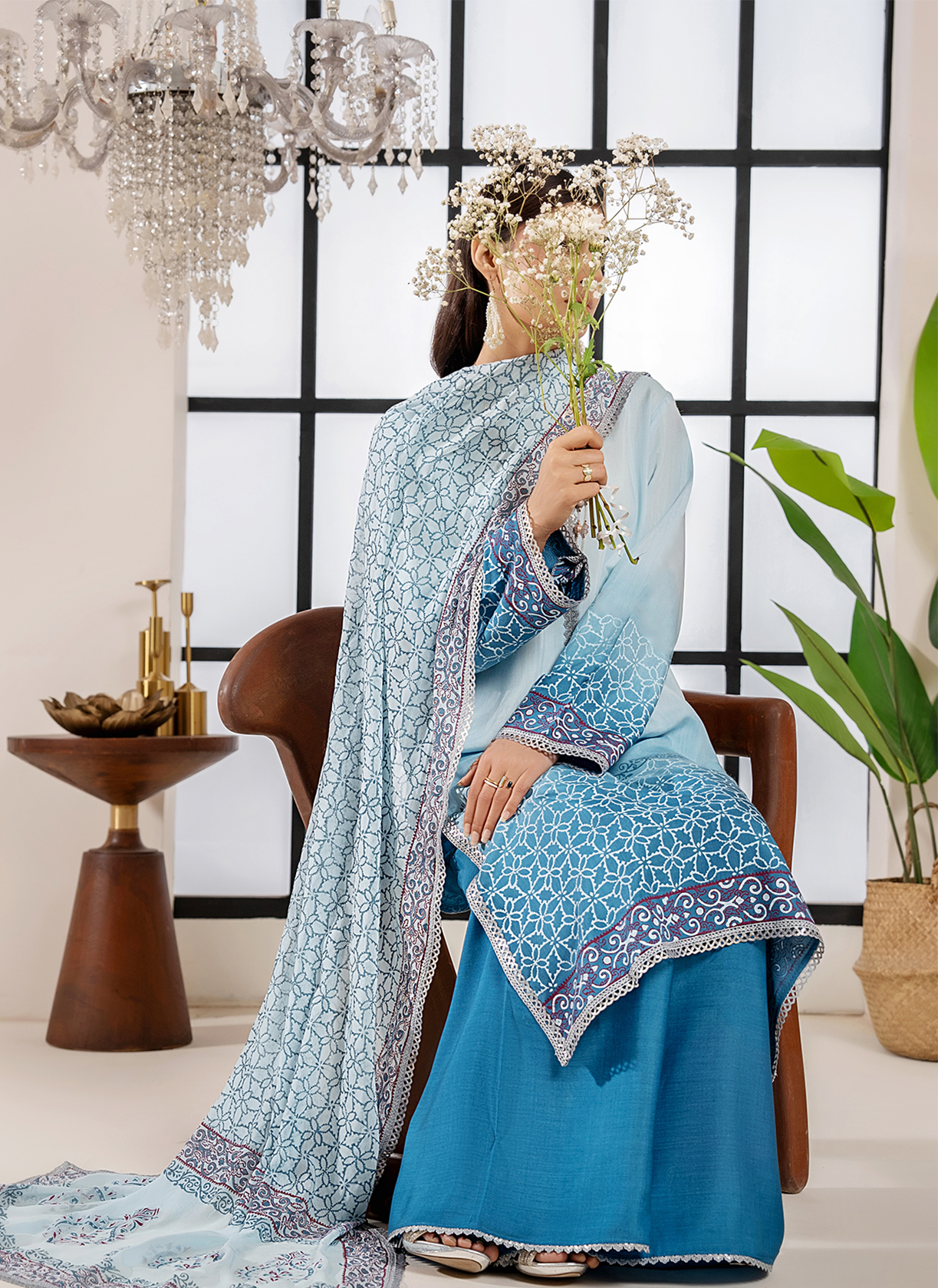 A dreamy canvas of ombré blues layered with geometric block print and paired with a breezy printed chiffon dupatta. Finished off with plain dyed trousers for a relaxed yet refined look.