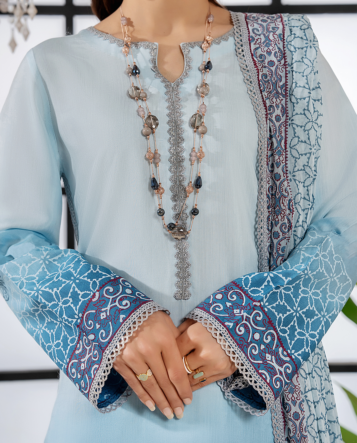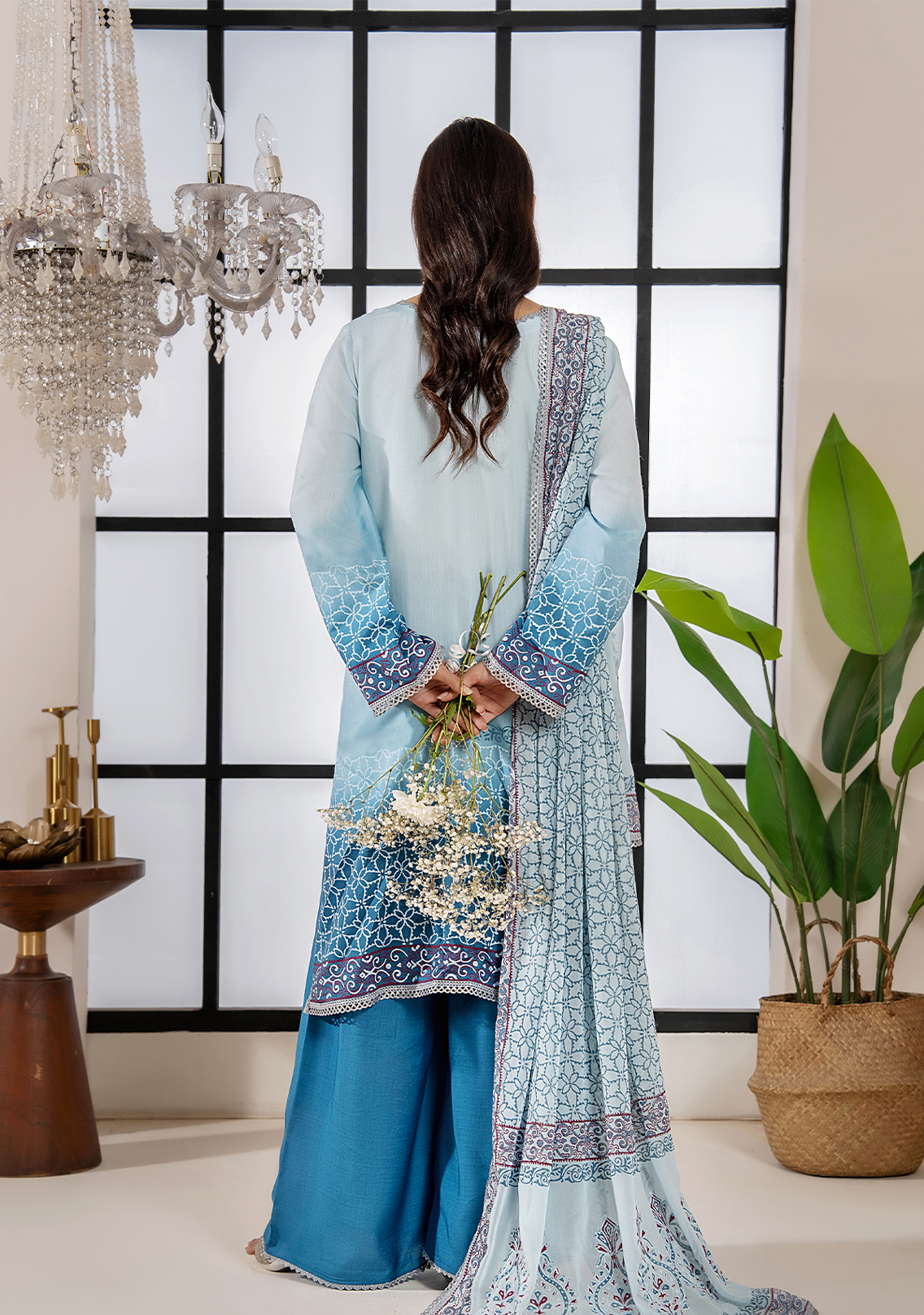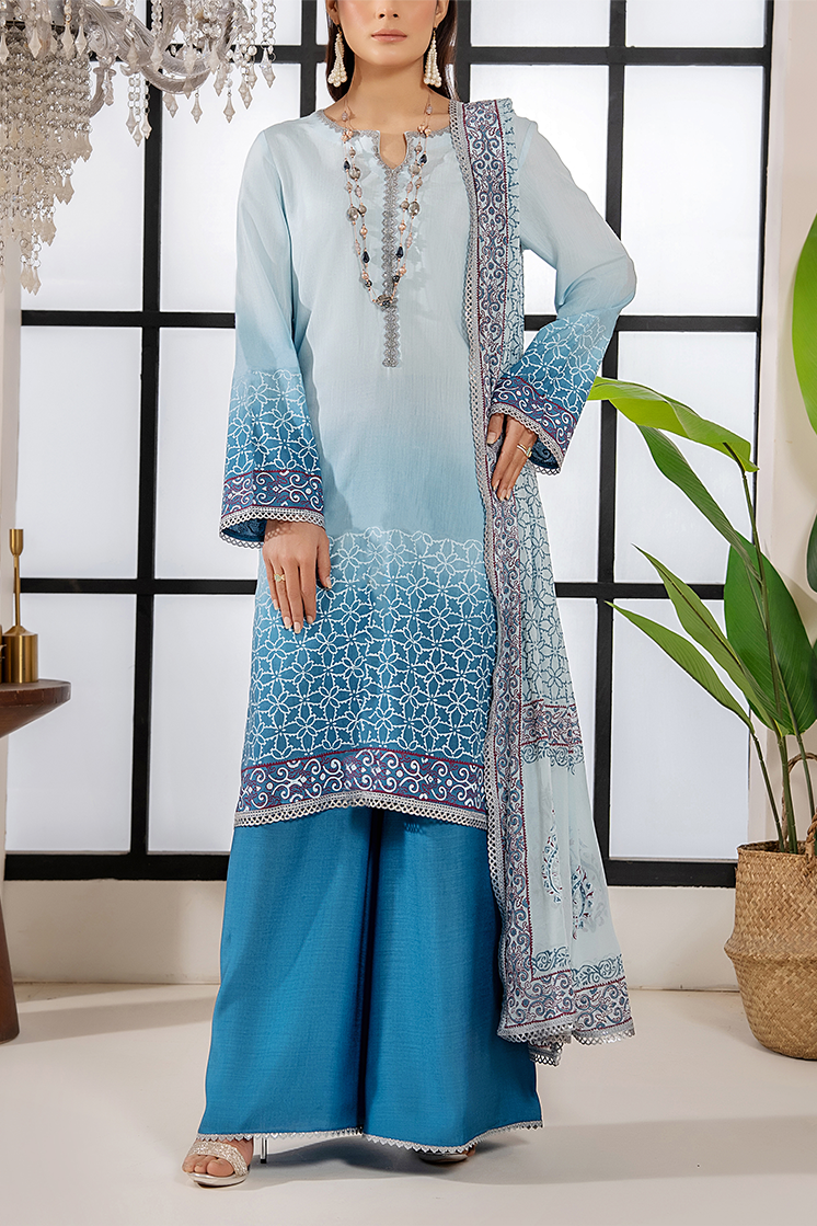 A dreamy canvas of ombré blues layered with geometric block print and paired with a breezy printed chiffon dupatta. Finished off with plain dyed trousers for a relaxed yet refined look.