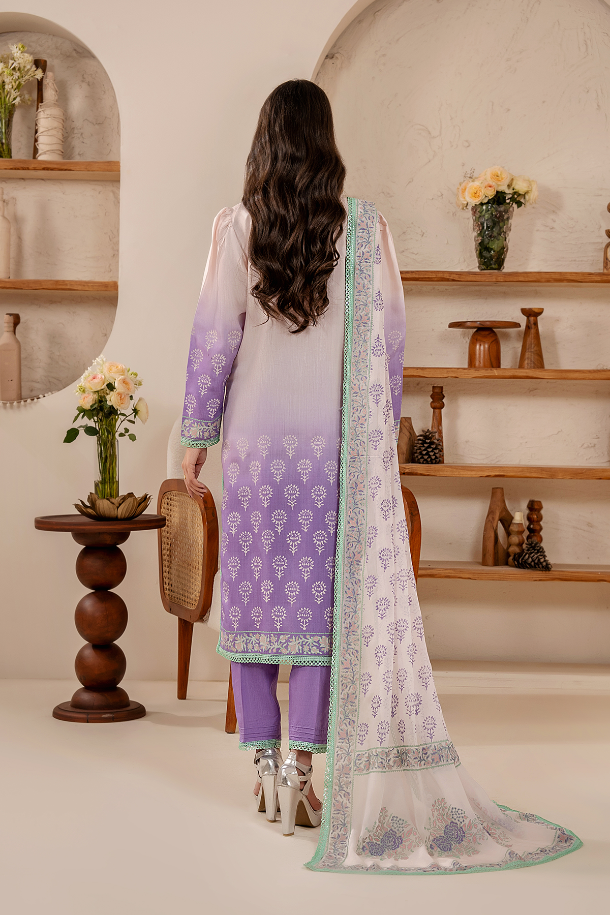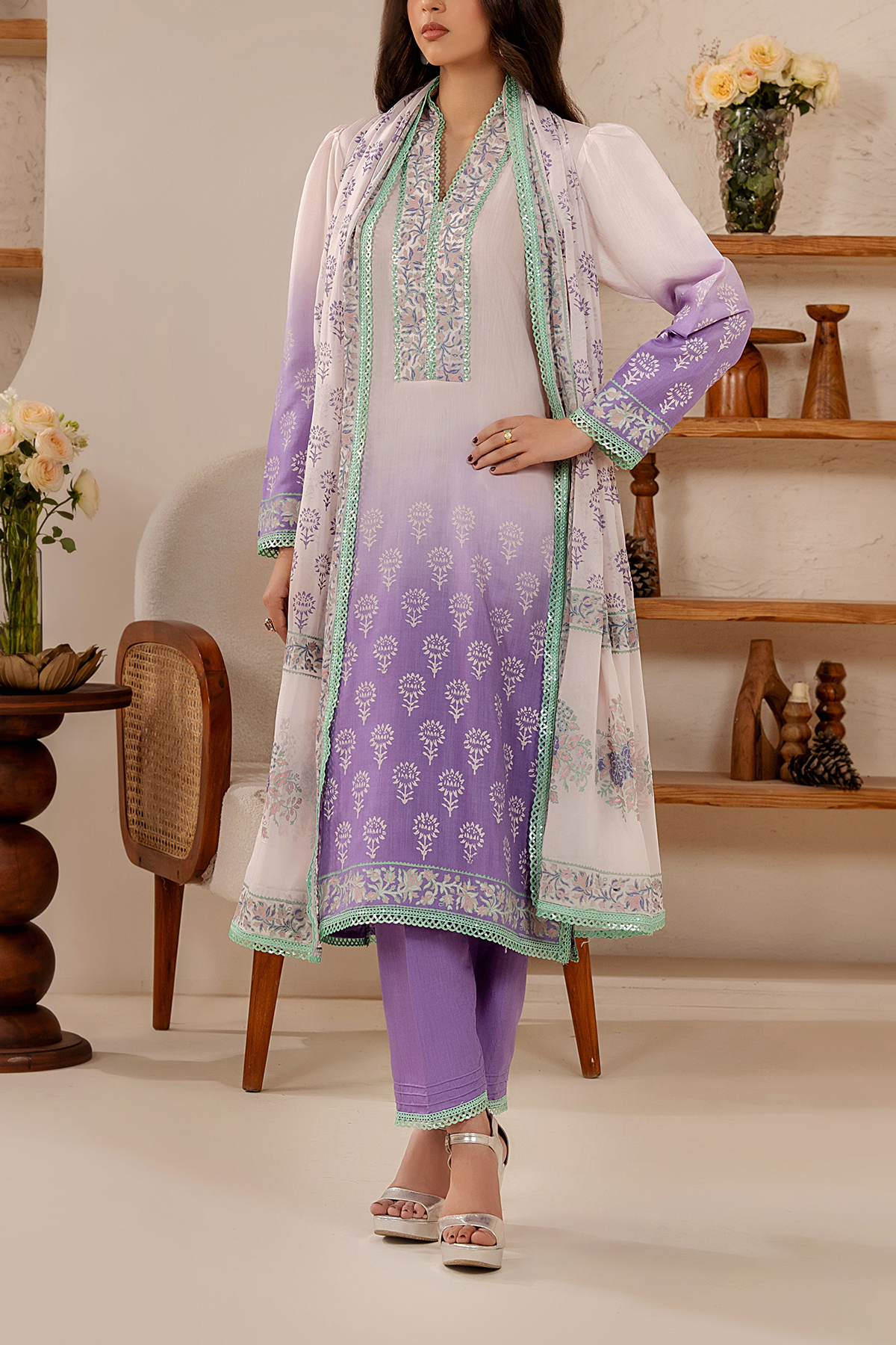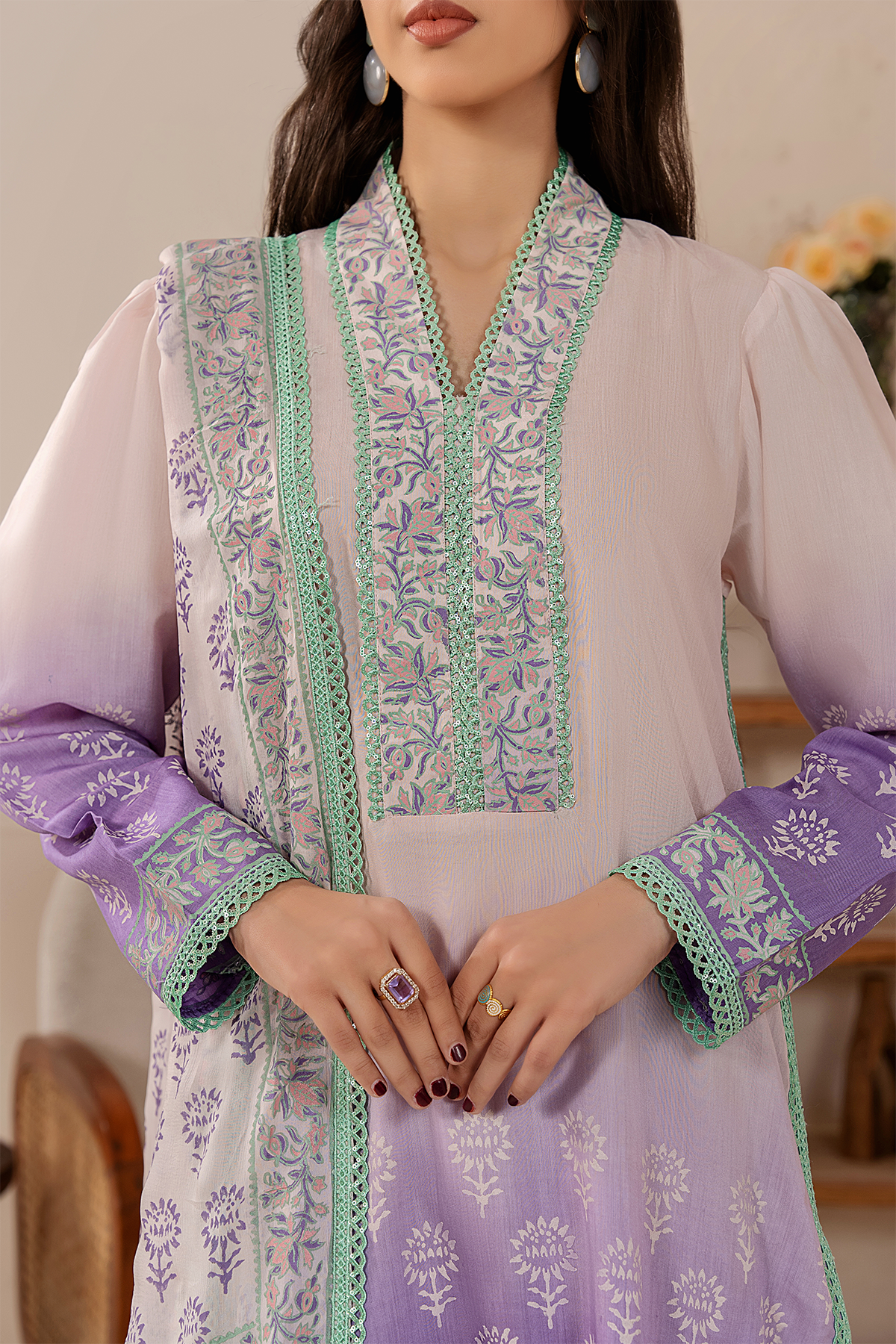 Breezy lilac dreams, this ombré tie-dye suit blooms with block print accents, styled with a sheer chiffon dupatta and matching trousers. Fresh, feminine, and effortlessly elegant.