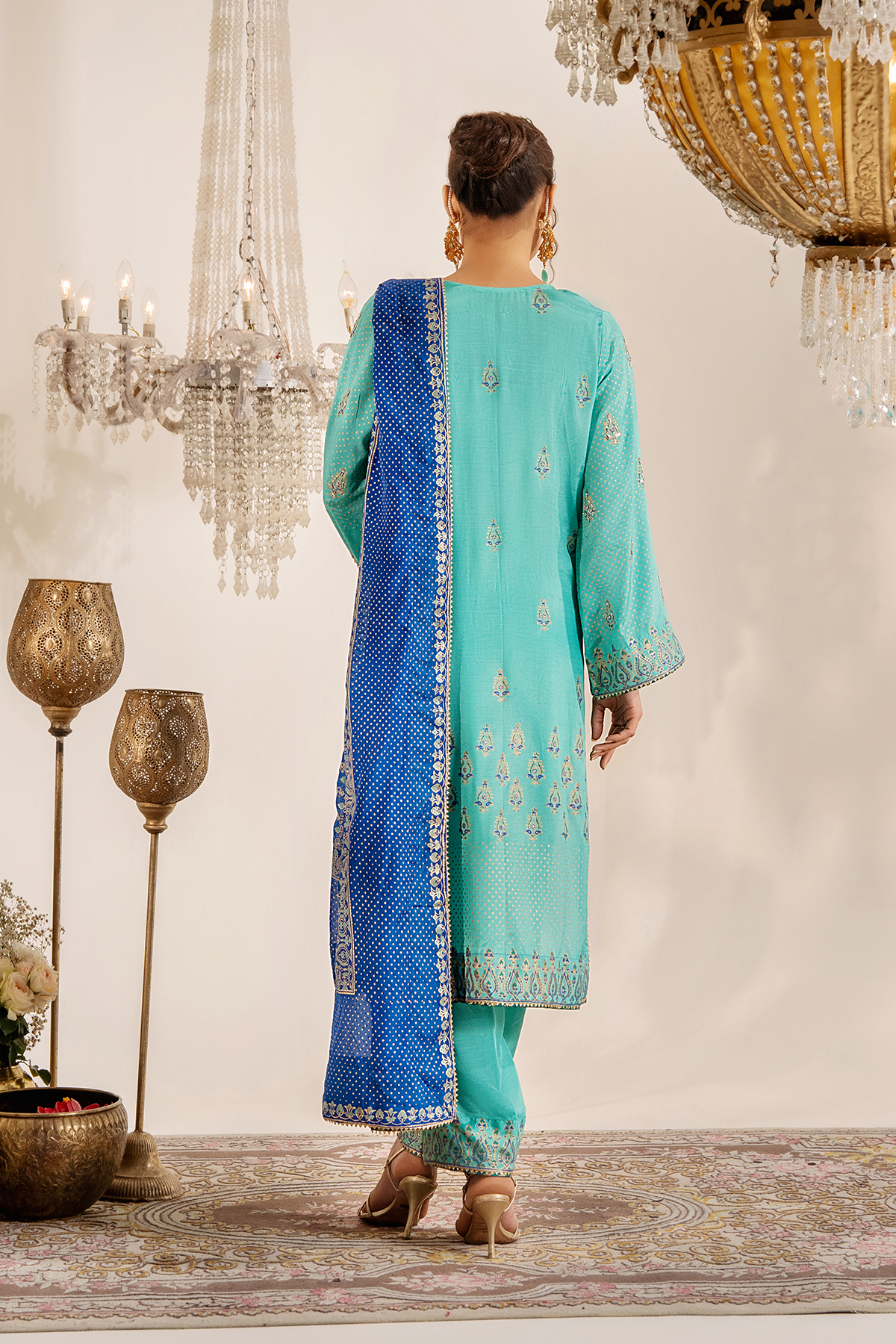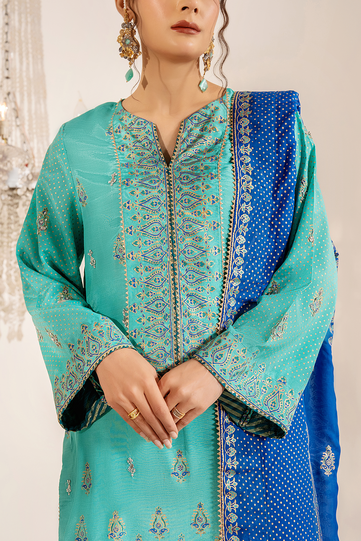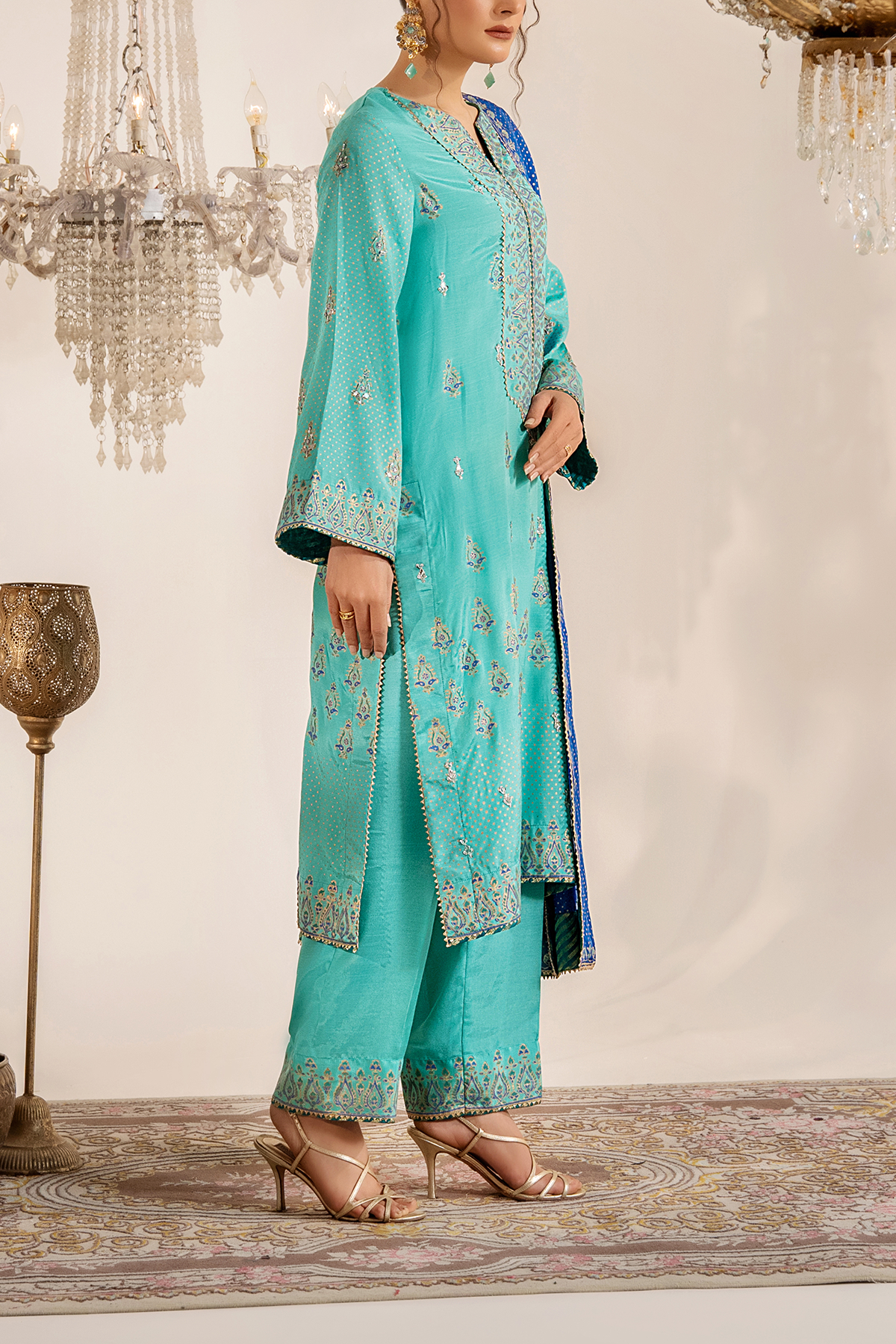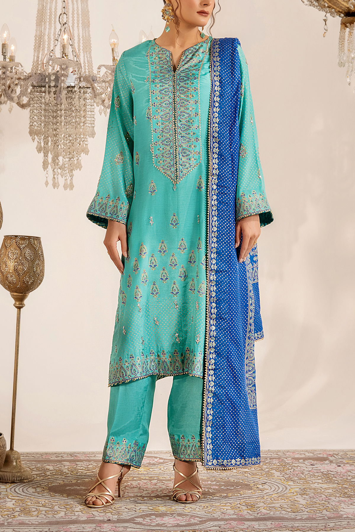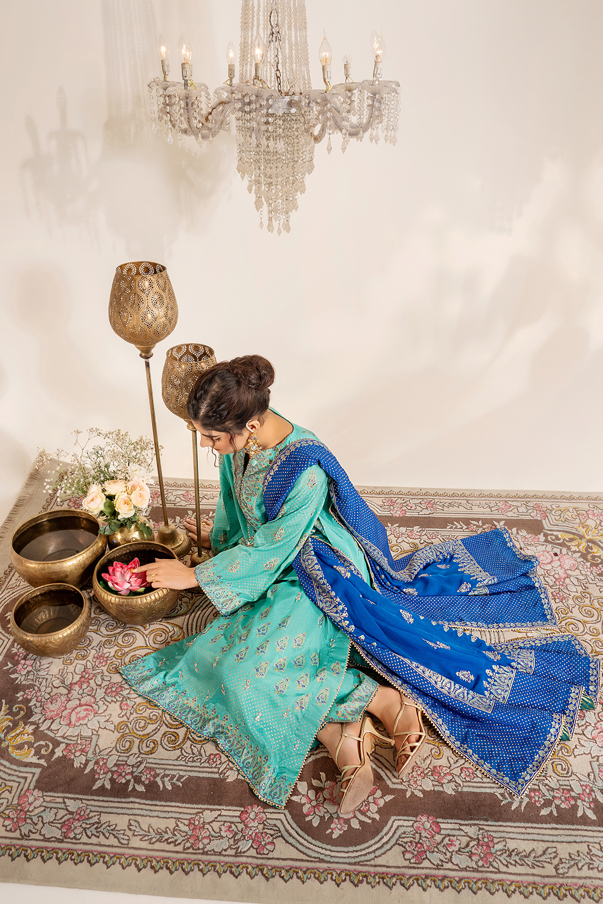 A stunning turquoise ensemble adorned with delicate block print, paired with a regal royal blue dupatta with luxe gold accents. Finished with intricate Kora Naqshi, Kundan, and Gota work, it’s a graceful look with a touch of festive charm.