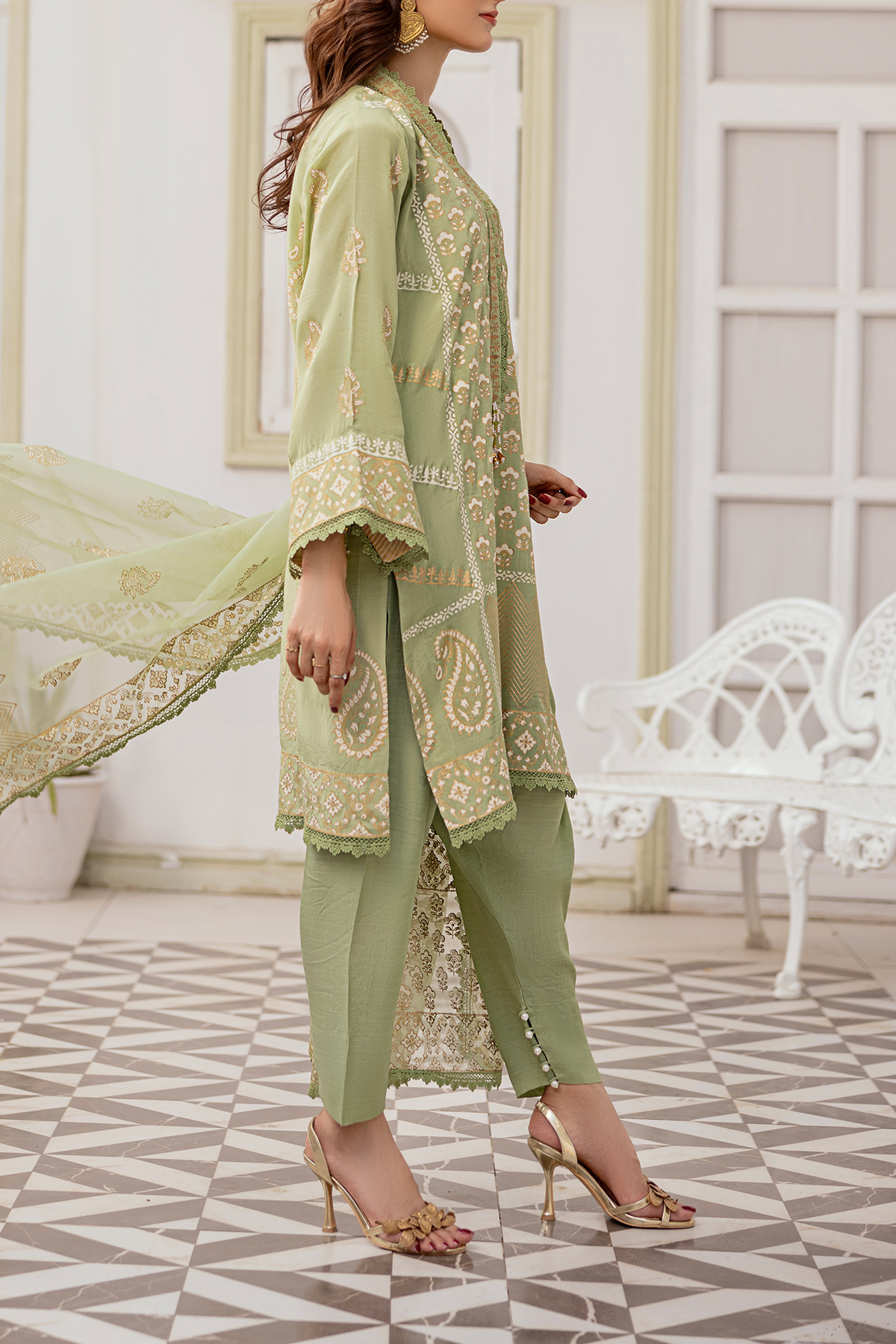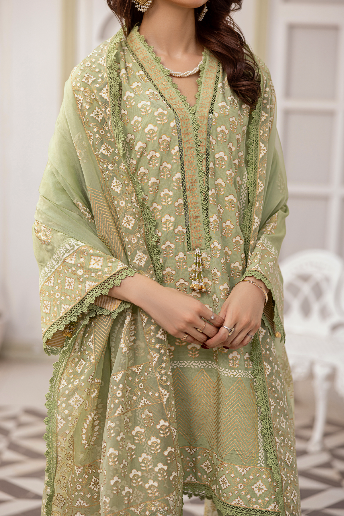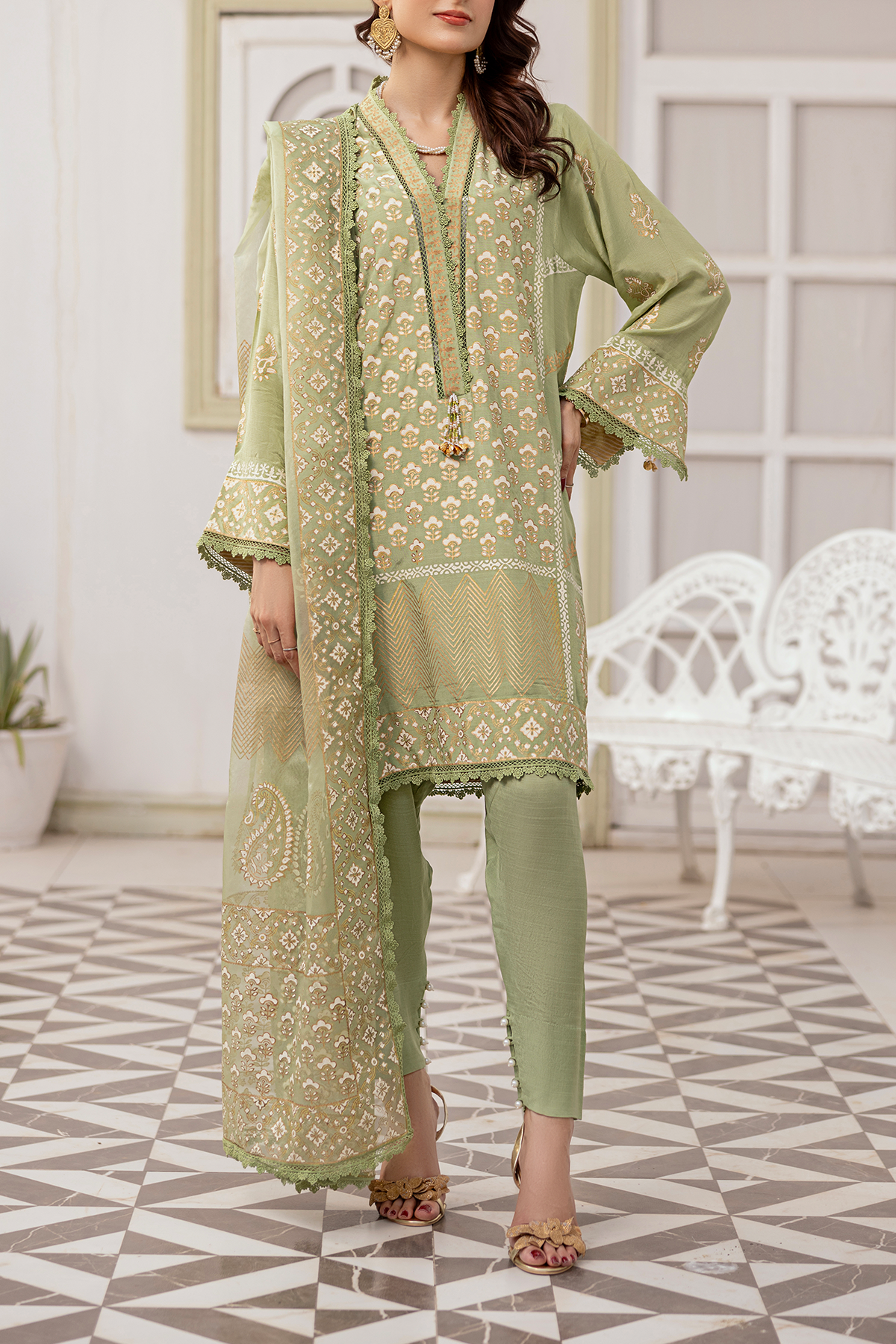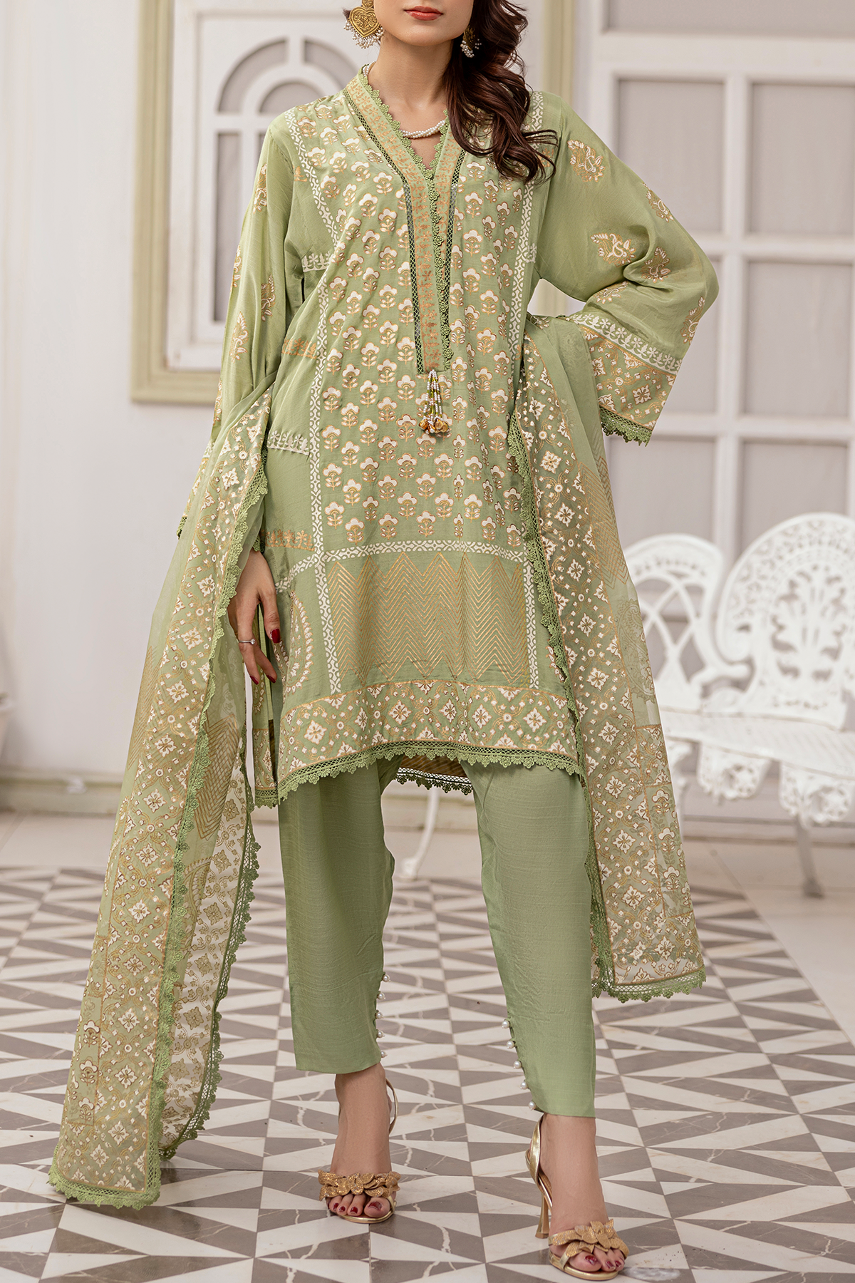 A harmonious blend of luxury and elegance. This exquisite outfit features an ivory and golden block print tunic in captivating shades of light green, perfectly paired with matching pants and a flowing embroidered dupatta. Embodying traditional beauty and modern sophistication, this ensemble is a 3-piece unstitched set.