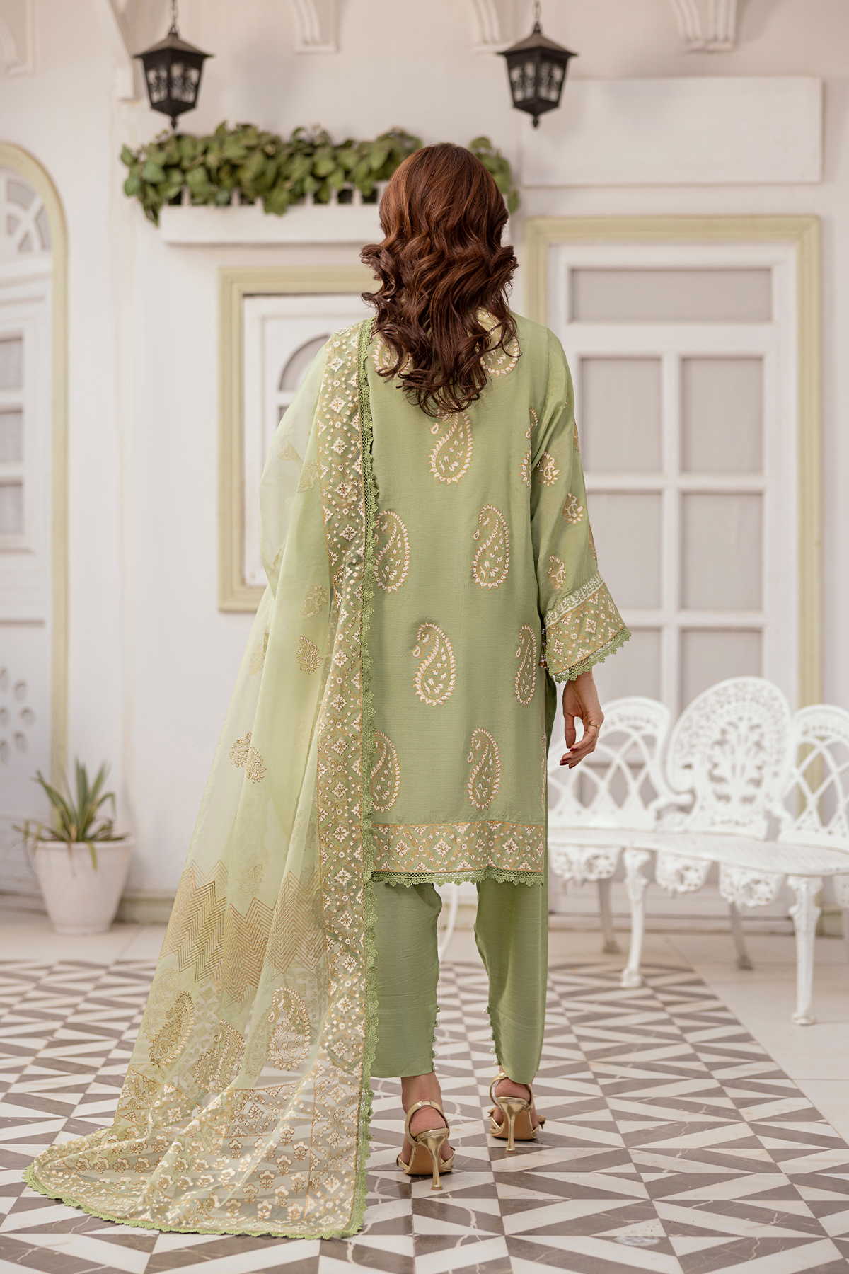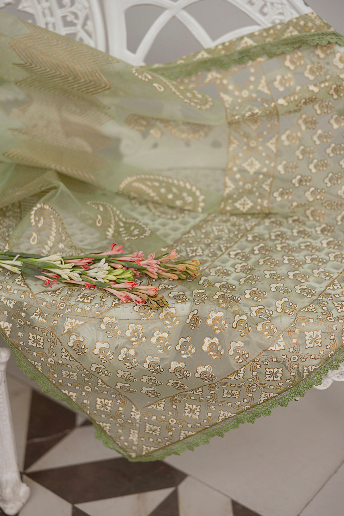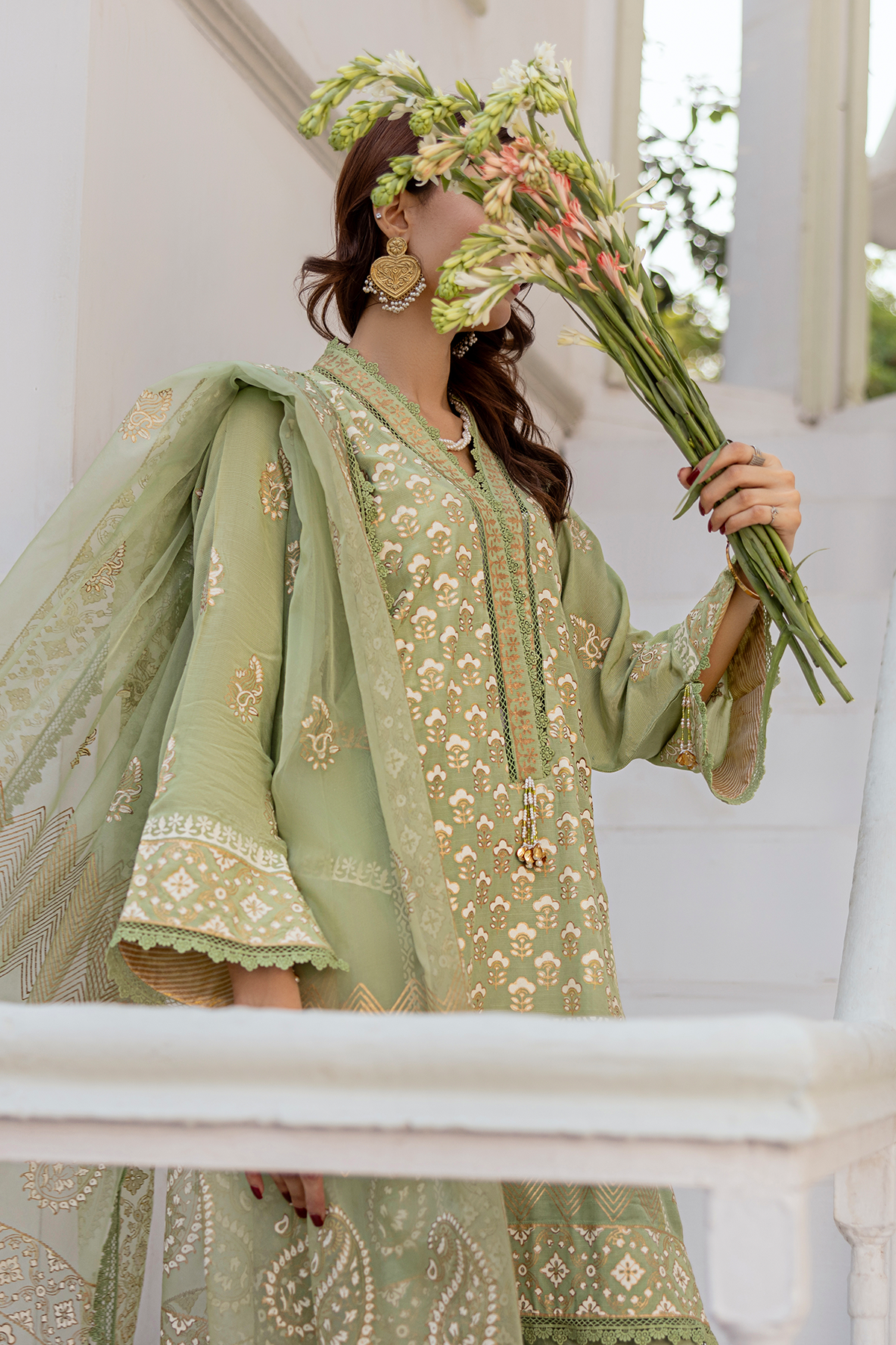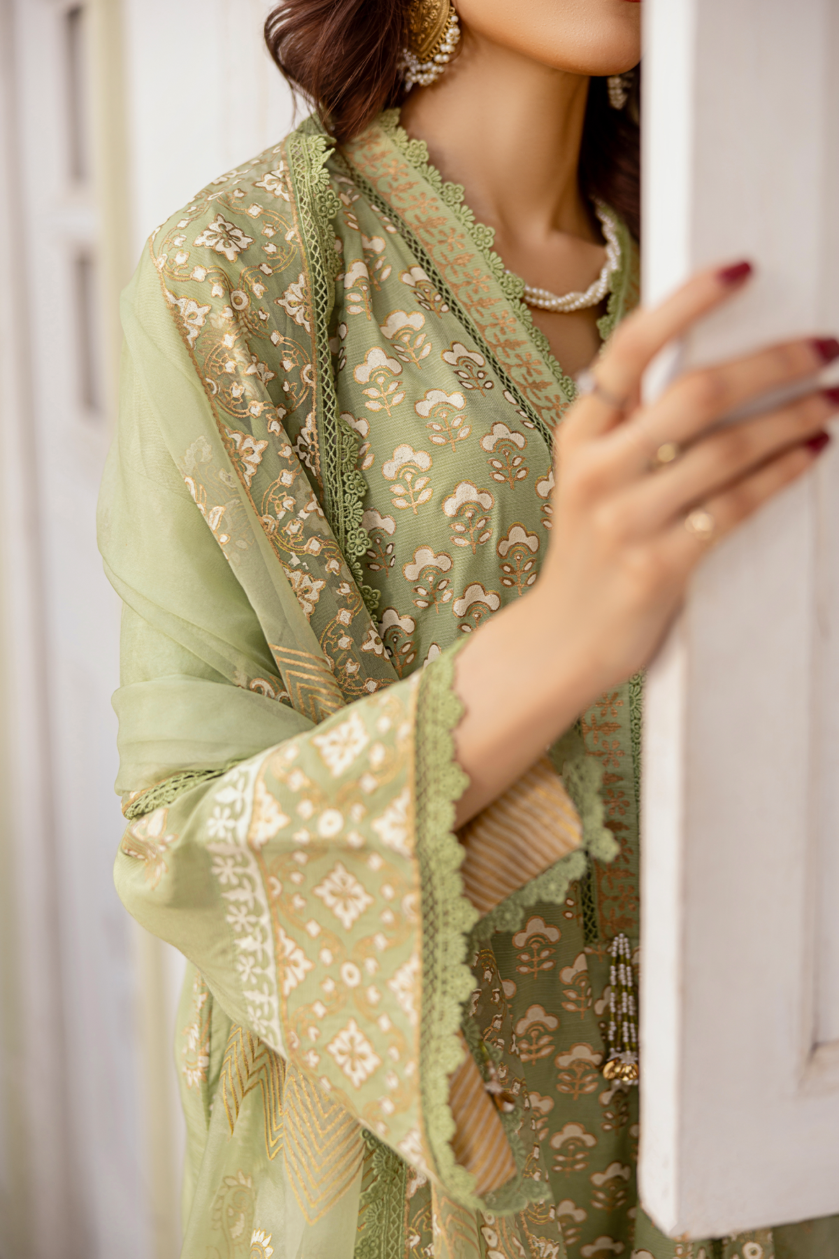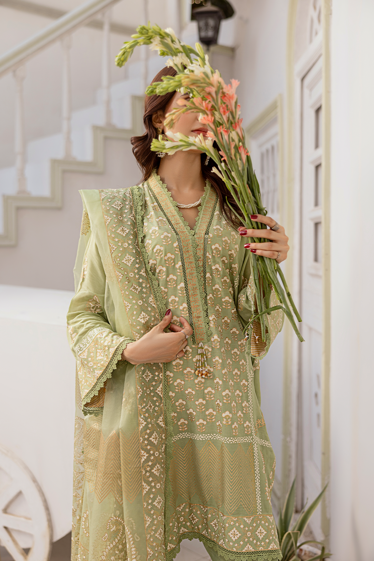 A harmonious blend of luxury and elegance. This exquisite outfit features an ivory and golden block print tunic in captivating shades of light green, perfectly paired with matching pants and a flowing embroidered dupatta. Embodying traditional beauty and modern sophistication, this ensemble is a 3-piece unstitched set.