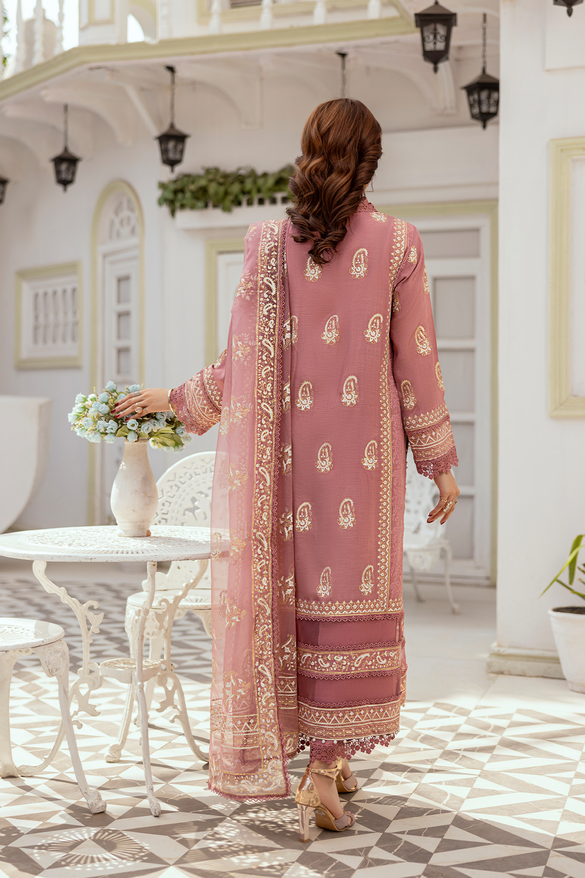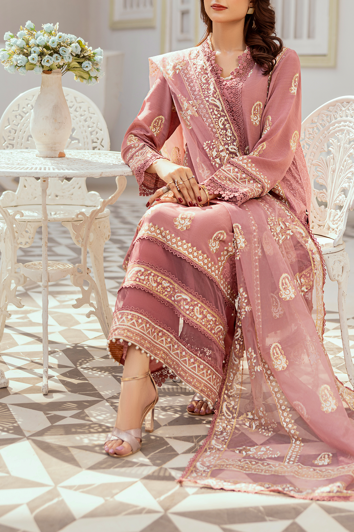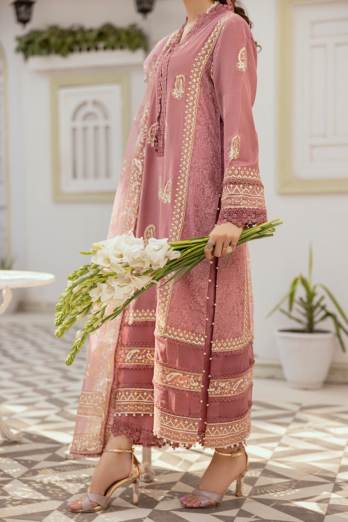An unstitched 3-piece pink outfit that exudes beauty and charm. Featuring a delicate hand block print in ivory and golden hues, showcasing intricate design and subtle elegance. The set includes a beautifully crafted shirt, paired with matching pants and a sheer dupatta.